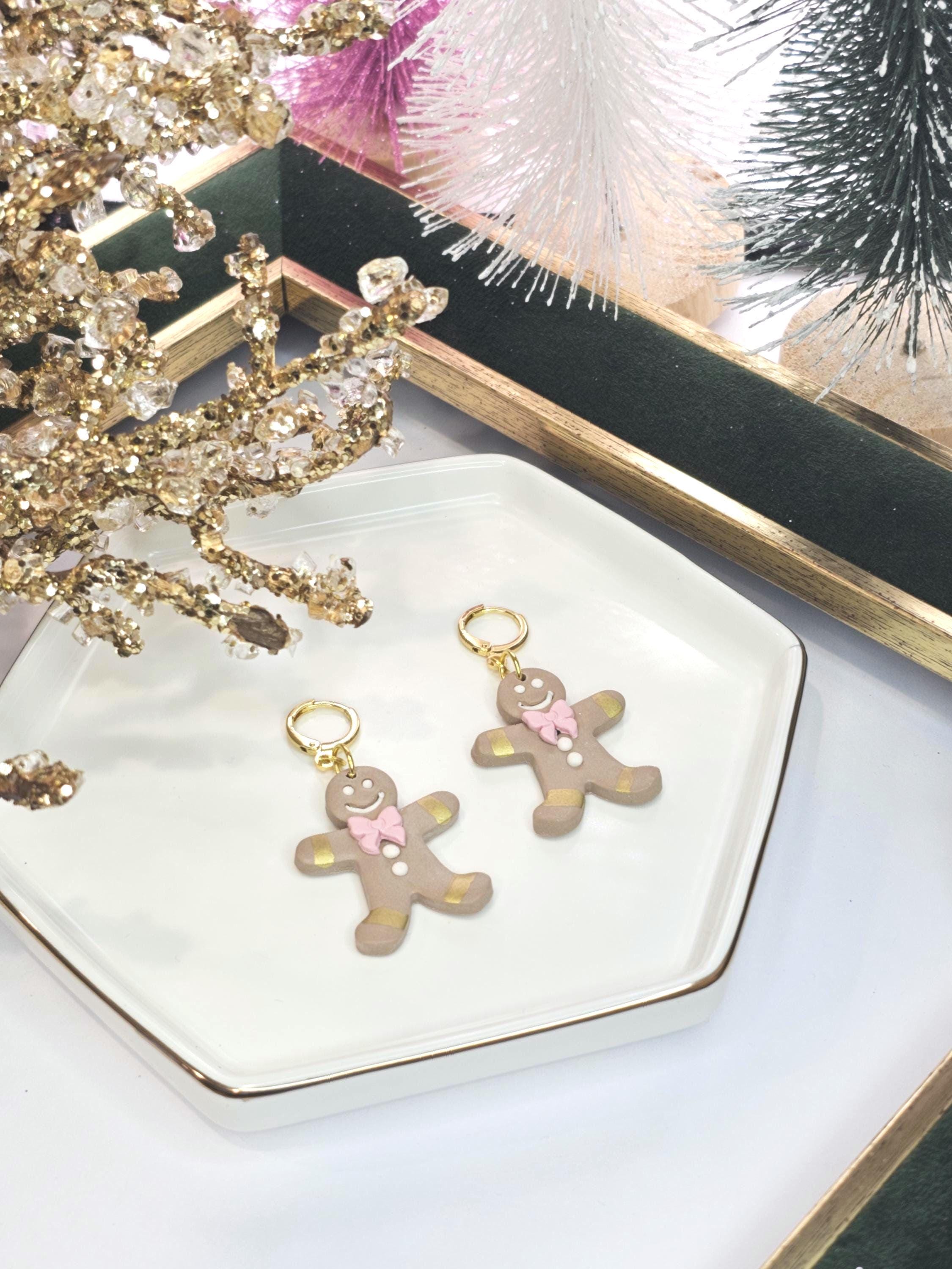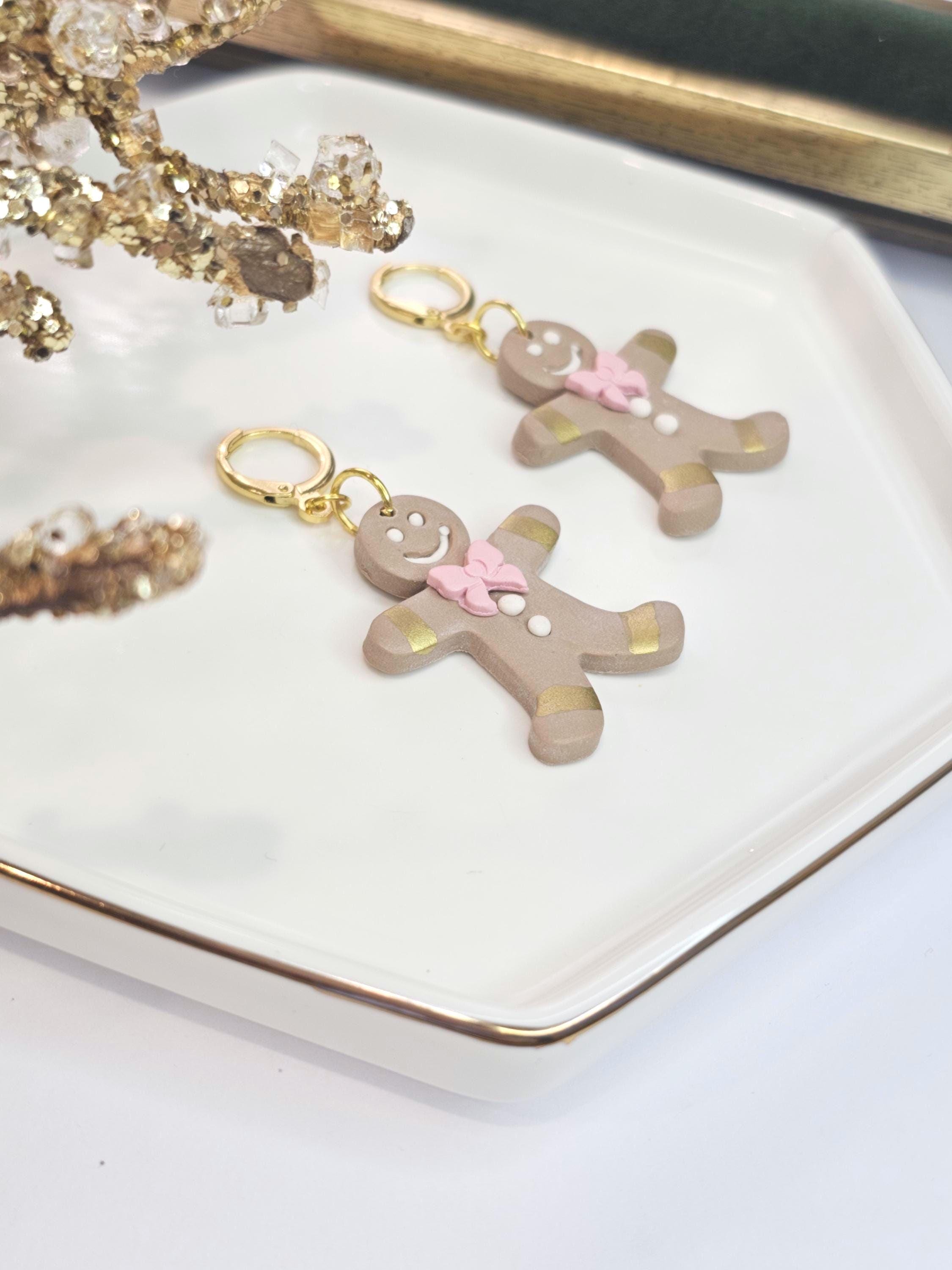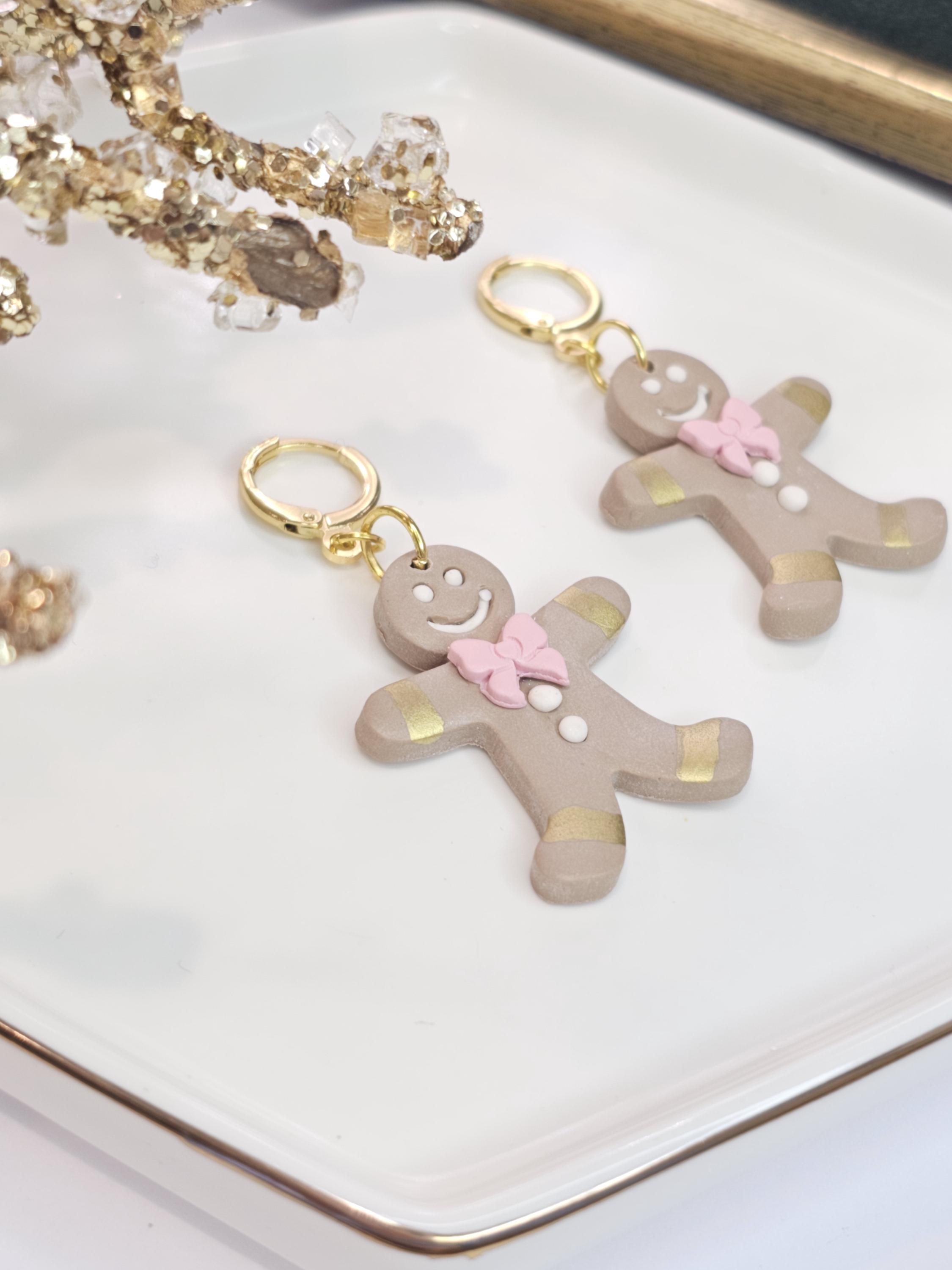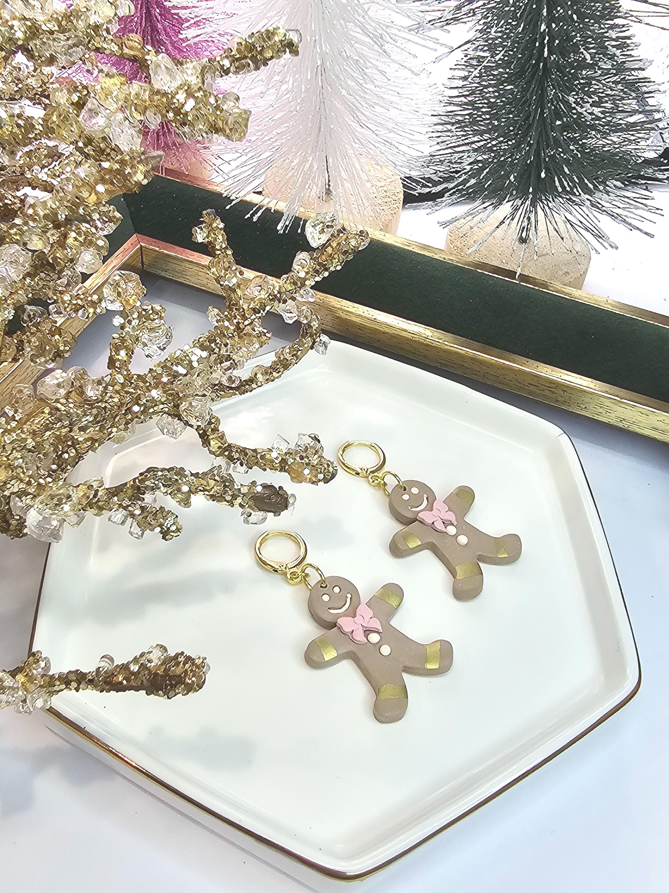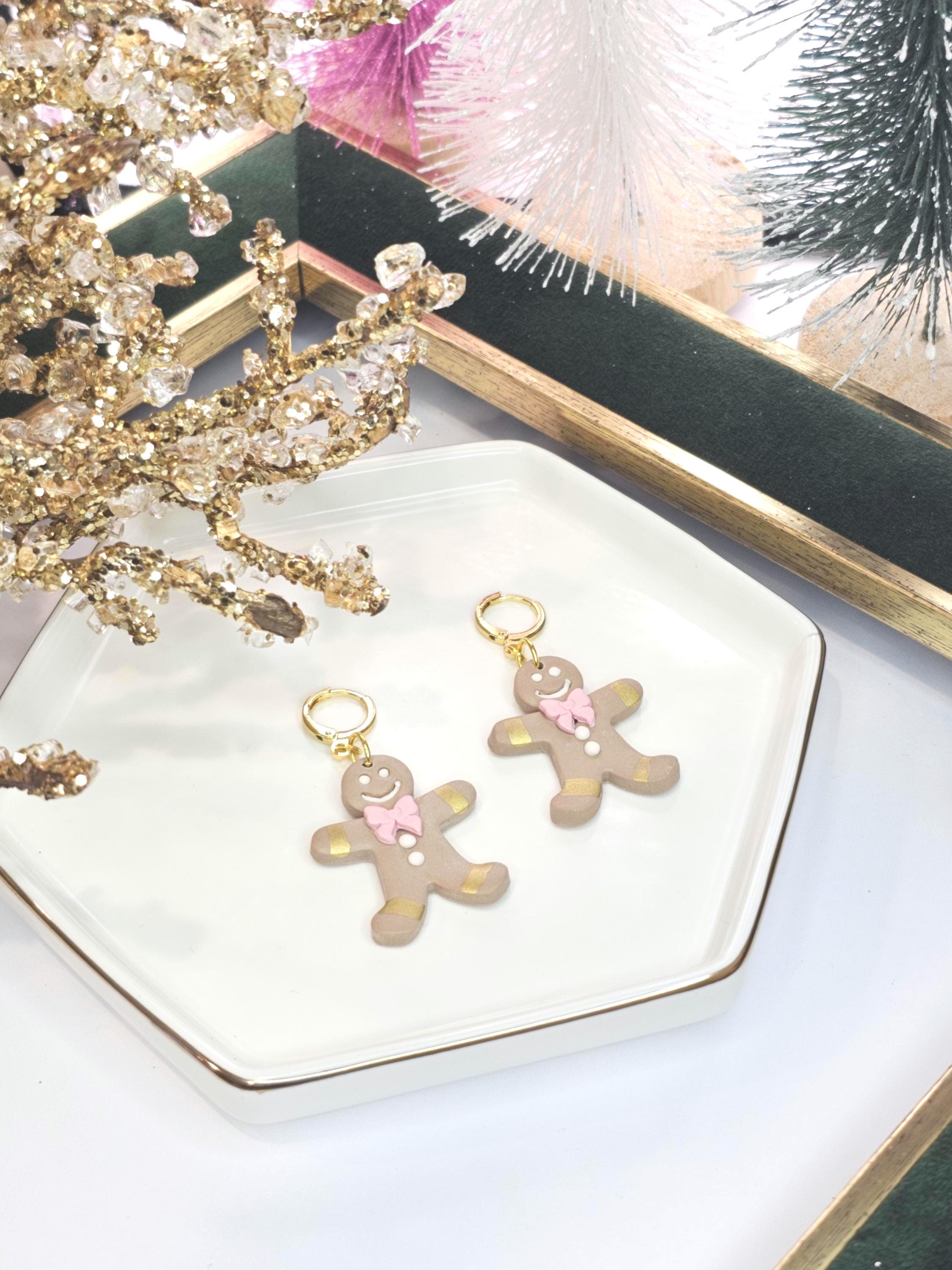 These charming gingerbread man earrings are the perfect festive accessory for the holiday season. Handcrafted from polymer clay, each earring features a delightful gingerbread man design with a pink bow, white icing details, and shimmering gold accents. Finished with a glossy resin coating, these earrings are lightweight, durable, and hypoallergenic for all-day comfort.