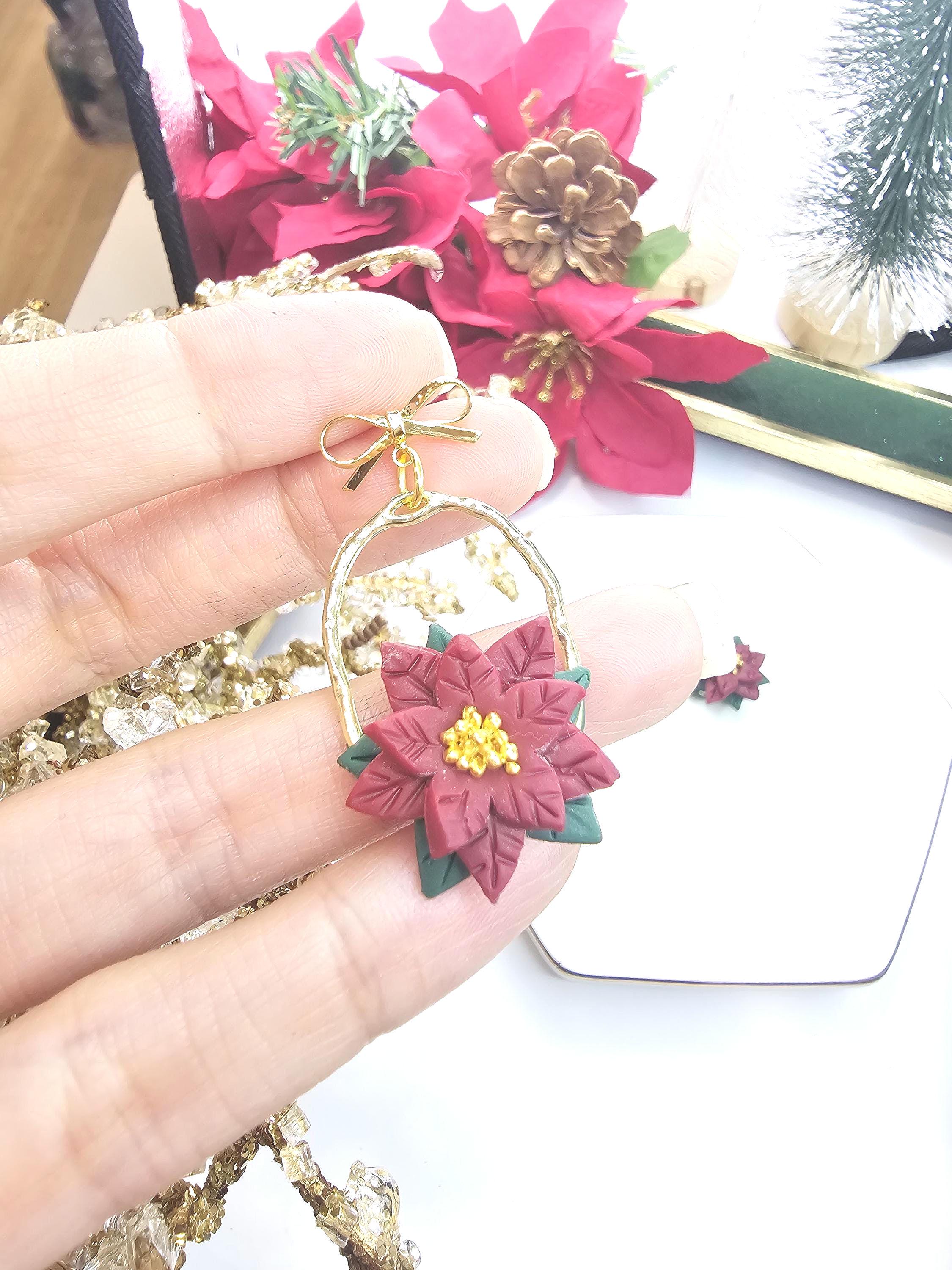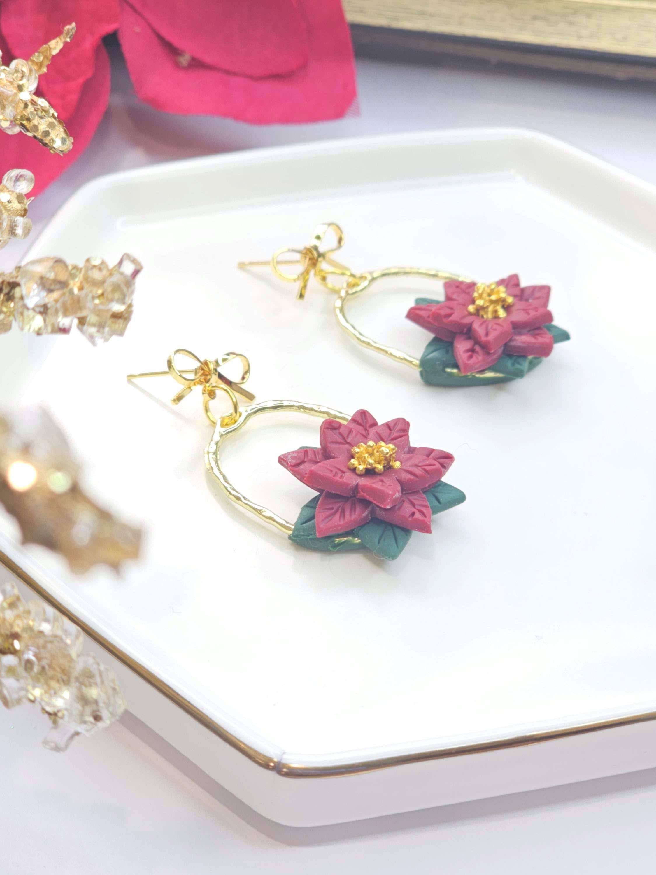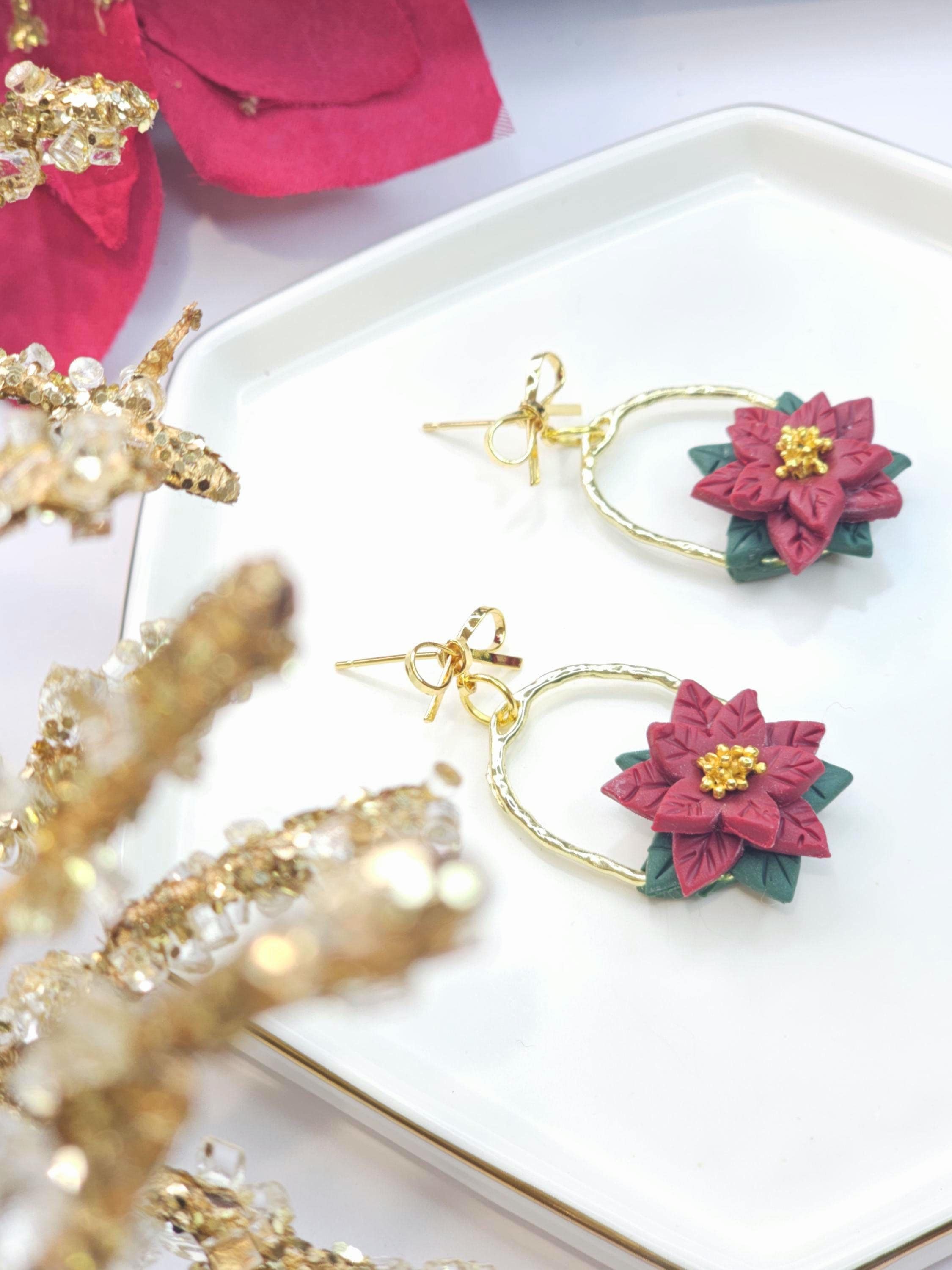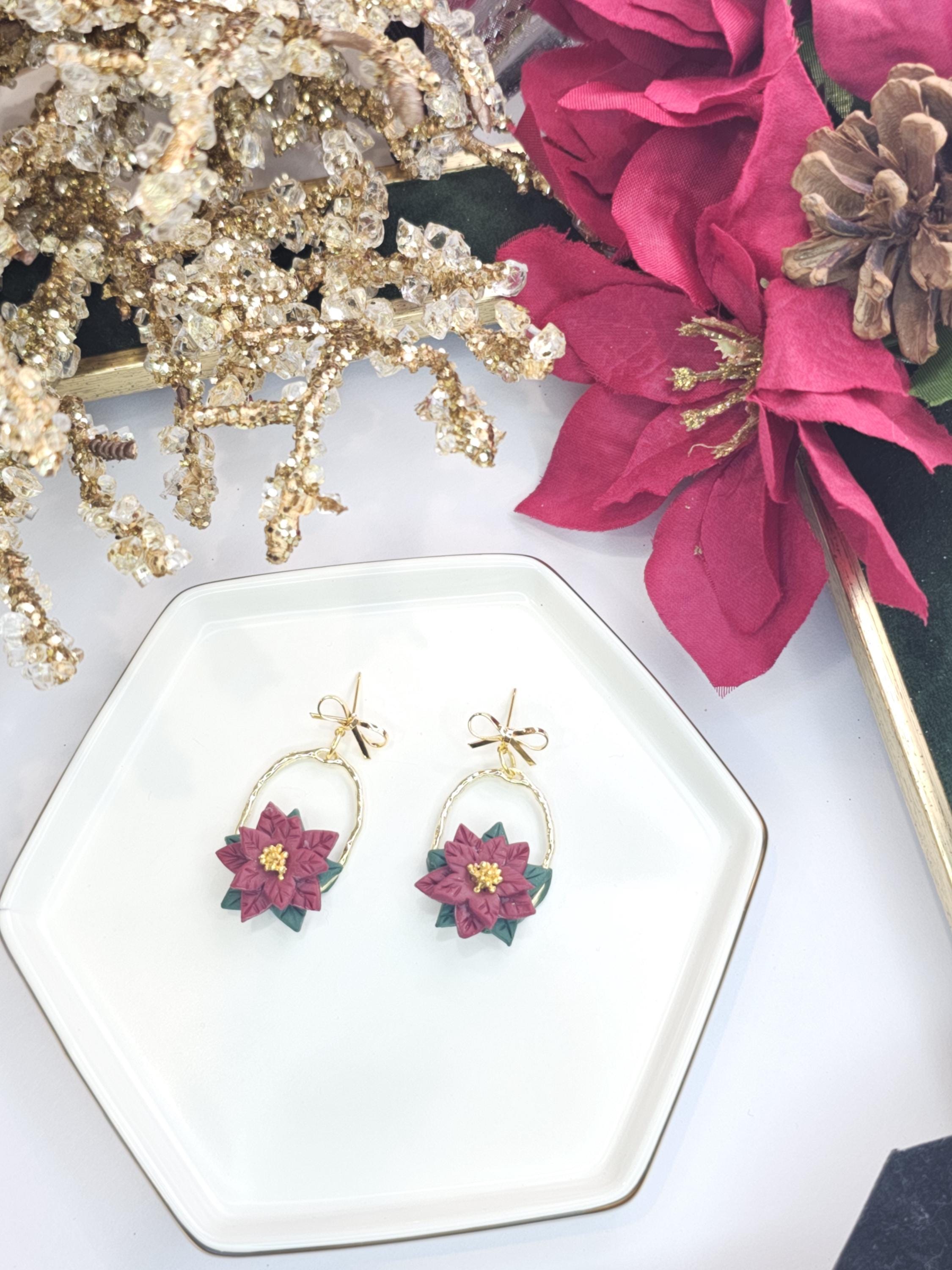 Celebrate the holiday season with these stunning handmade earrings inspired by the timeless beauty of poinsettias. Featuring soft red clay poinsettia flowers, dark green leaves, and golden accents, these earrings are set on a hammered gold hoop and adorned with delicate gold bows for an extra festive touch.