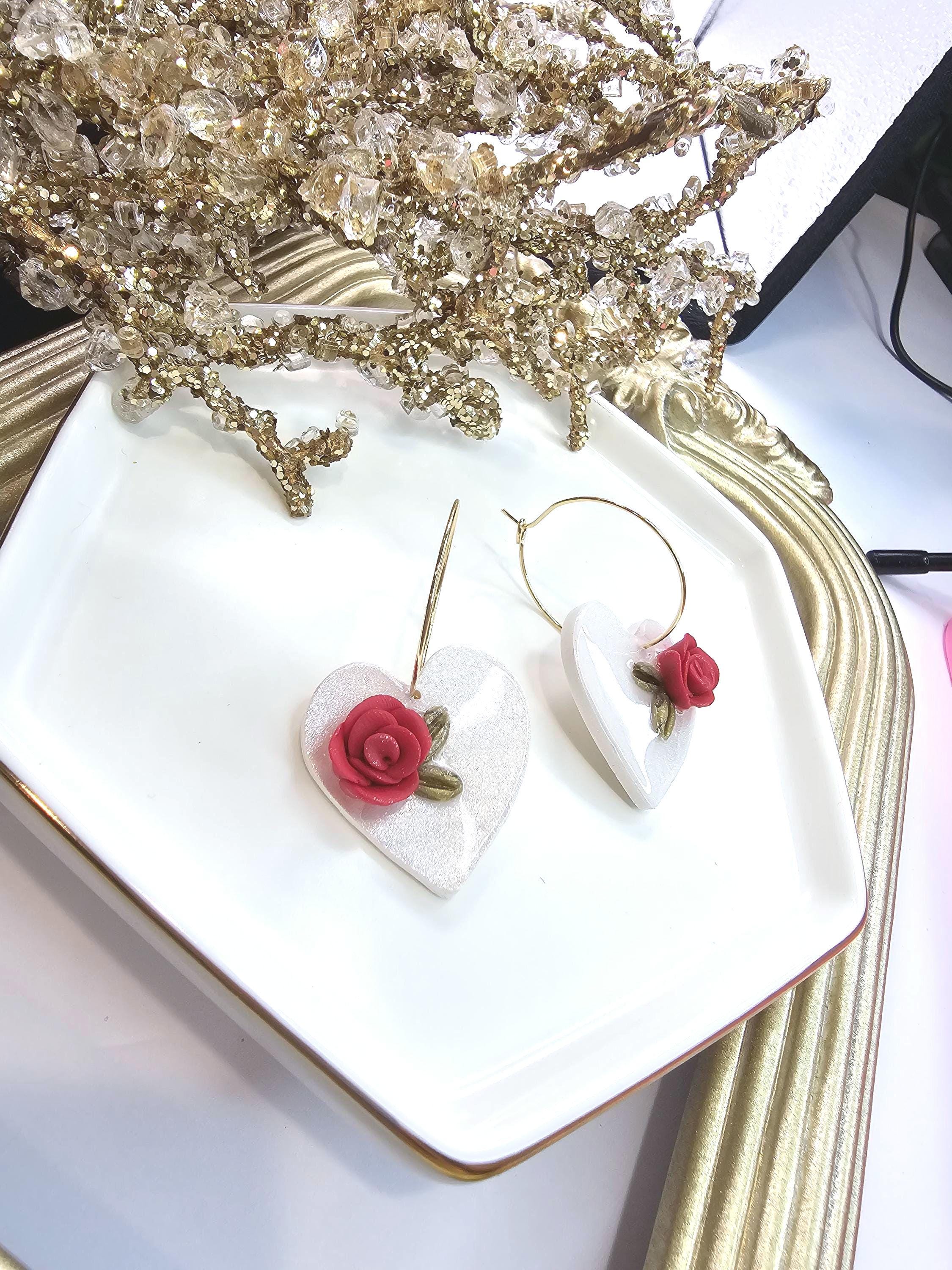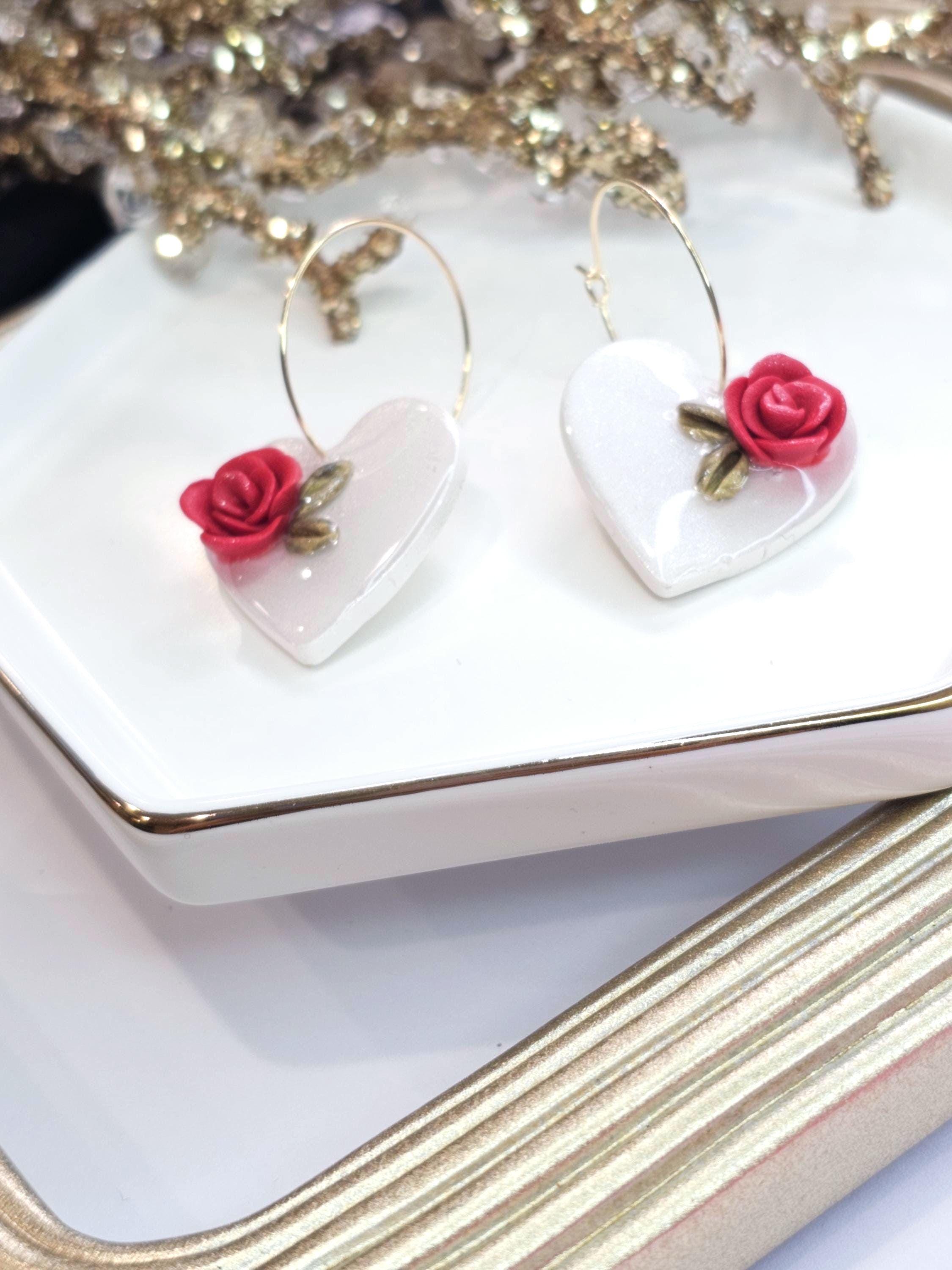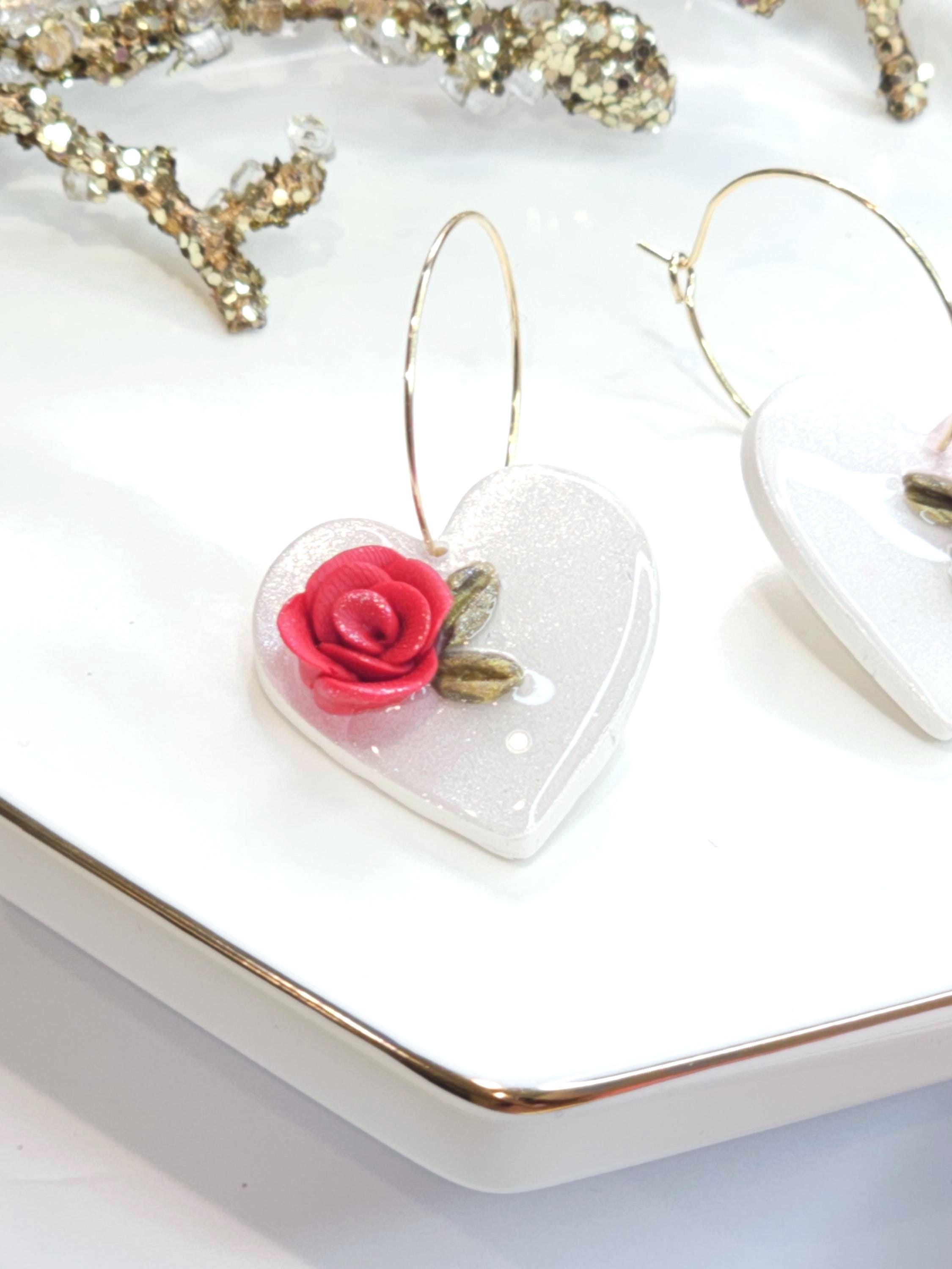 Bring a touch of elegance and charm to your style with these handmade white heart earrings featuring a delicate red rose design.