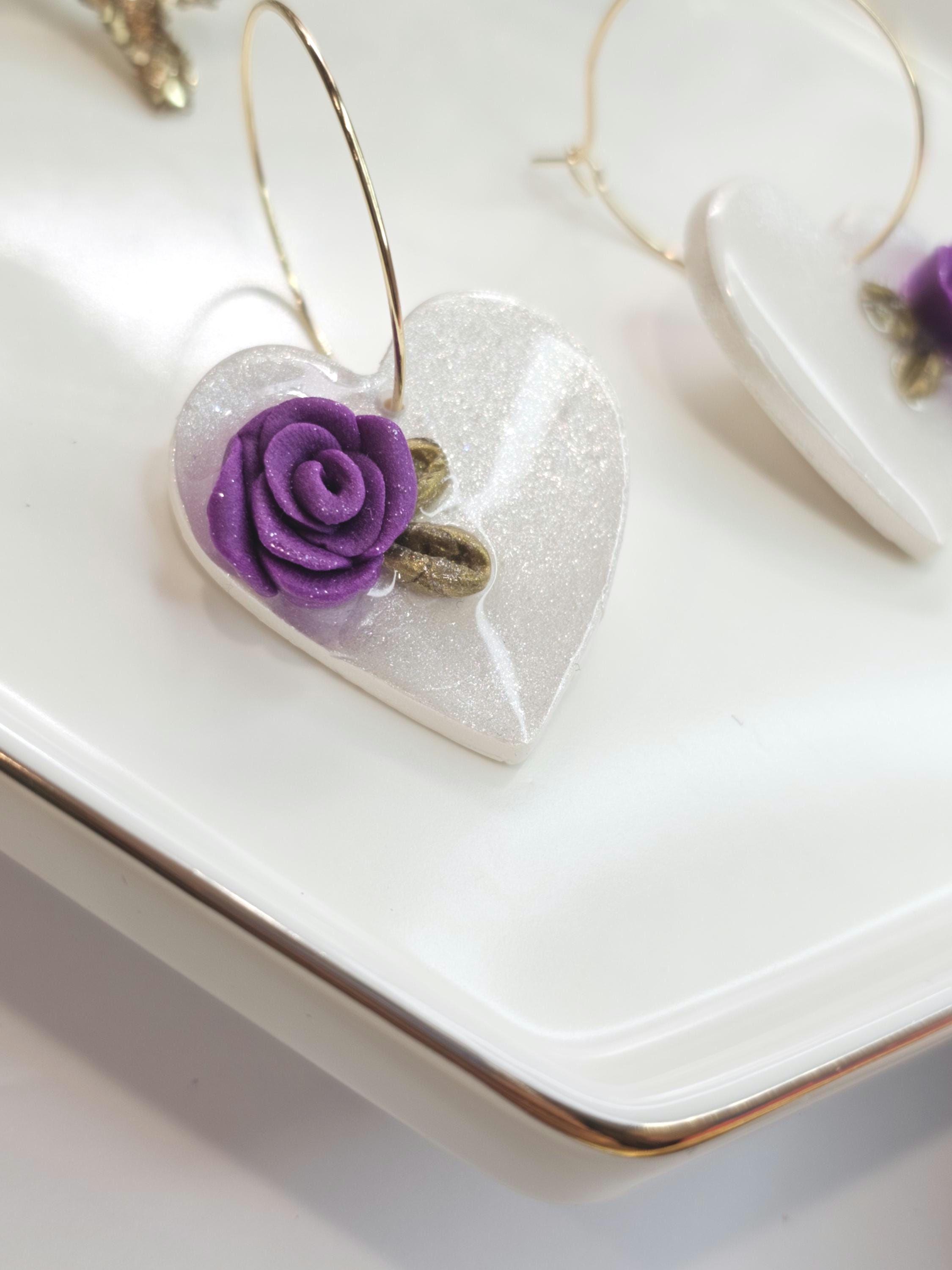 Bring a touch of elegance and charm to your style with these handmade white heart earrings featuring a delicate purple rose design.