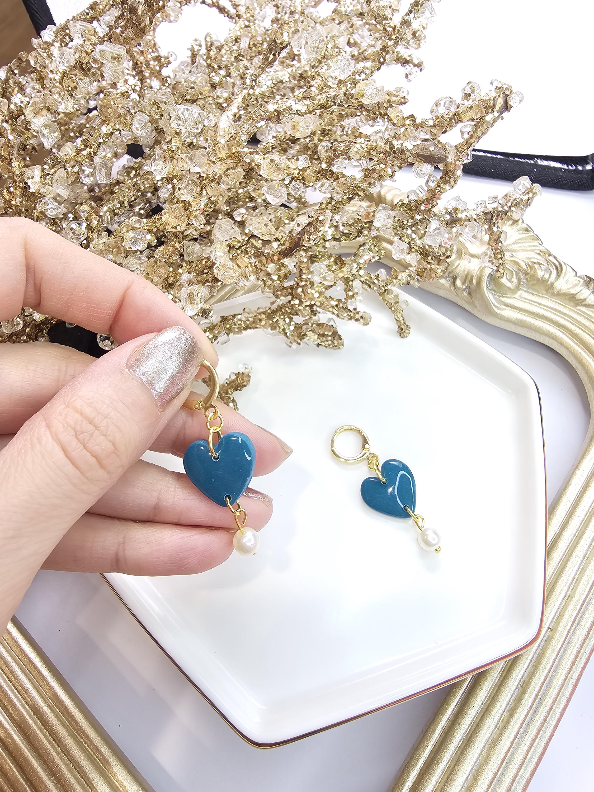 Make a bold yet graceful statement with these romantic Blue heart dangle earrings. Featuring a glossy resin heart accented with a delicate pearl and gold-plated details, these earrings exude elegance and charm. Whether you're looking for the perfect Valentine's Day gift or a chic addition to your jewelry collection, these earrings are a timeless choice.