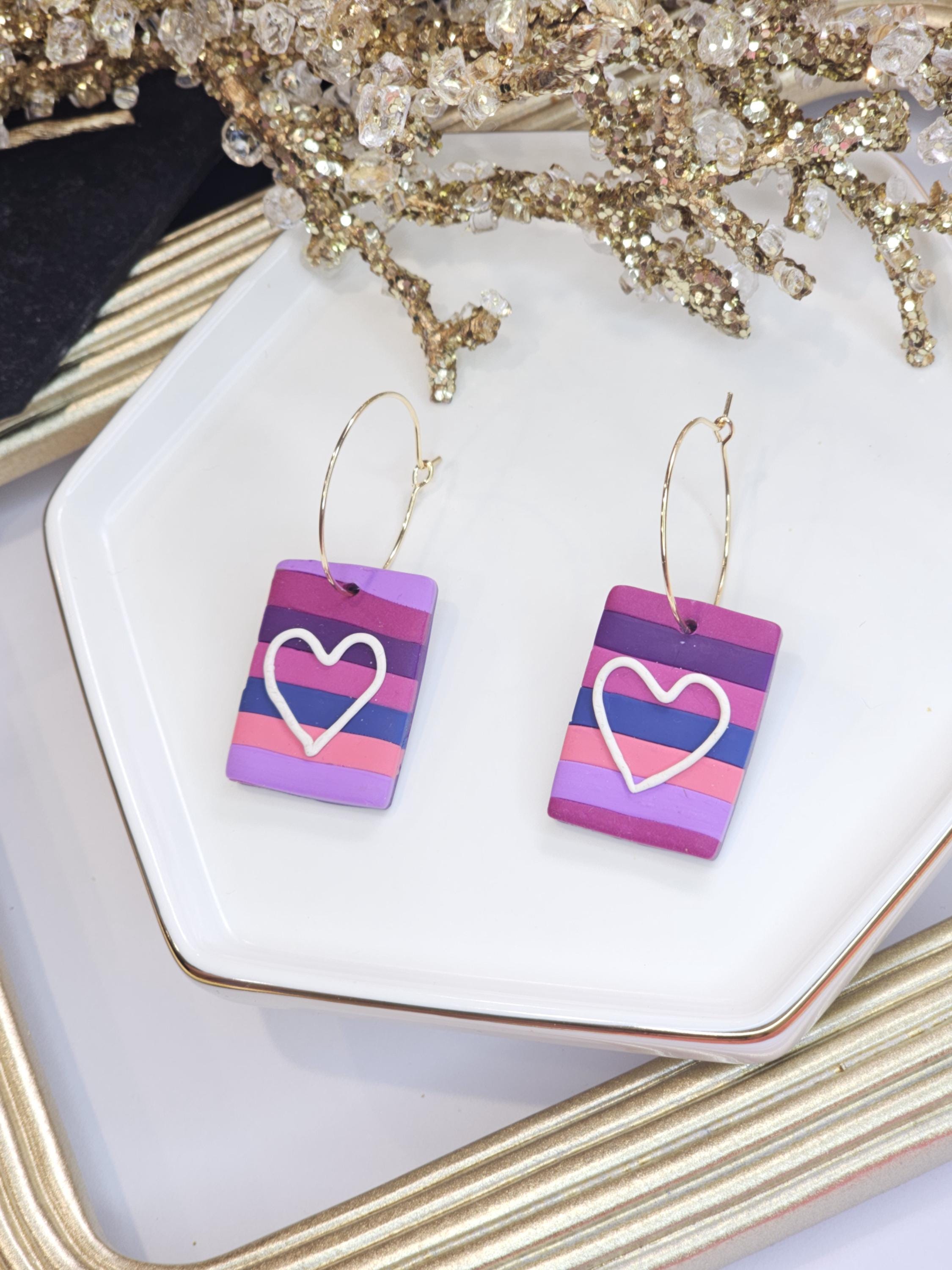 Make a statement with these bold striped rectangle earrings, featuring a charming white heart detail. Handcrafted from polymer clay with a vibrant purple, pink, and blue striped design, these earrings are lightweight, unique, and perfect for adding a pop of color to any outfit. The gold-plated hoop adds an elegant touch to this playful design.