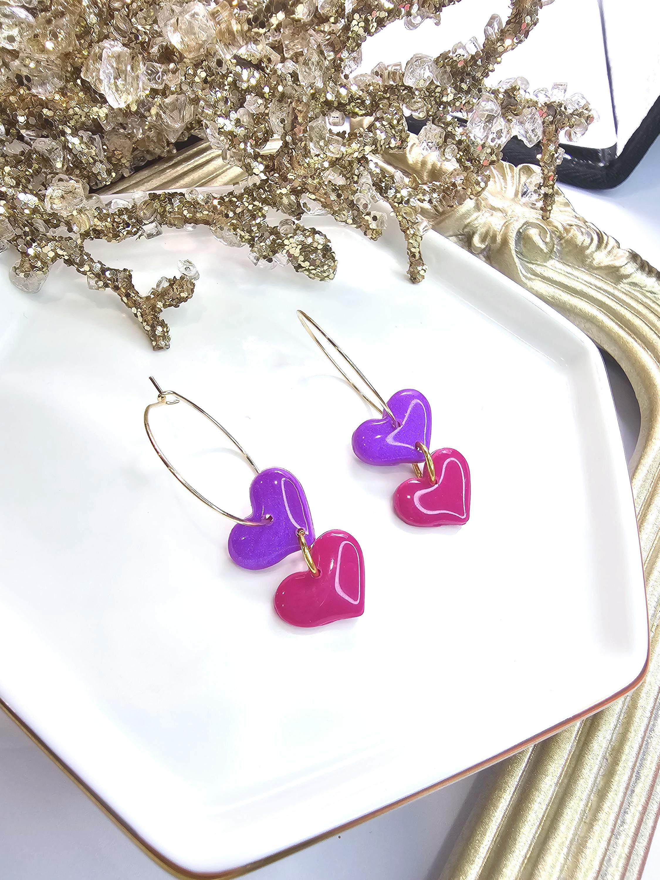 Show off your bold and fun style with these double-heart hoop earrings! Featuring vibrant pink and purple polymer clay hearts, coated in a glossy resin finish, these earrings are lightweight and perfect for making a statement. The dangling hearts hang elegantly from gold-plated hoops, adding a touch of glamour to the playful design.