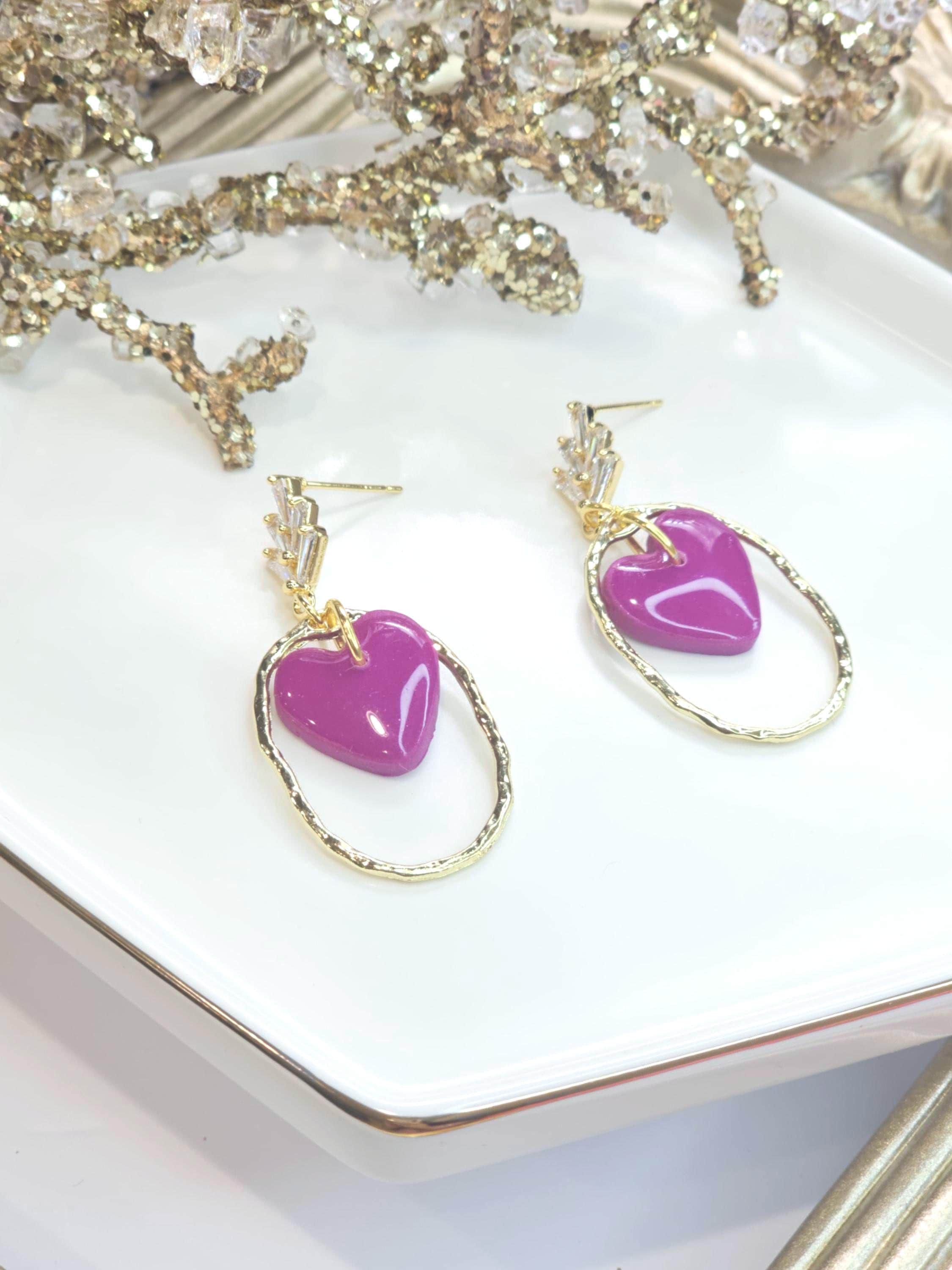 These elegant earrings feature Burgundy hearts, handmade from polymer clay and coated with a glossy resin finish for a luxurious shine. The heart dangles gracefully from a textured gold-plated hoop, adding a modern and stylish touch. The earrings are anchored by a sparkling cubic zirconia stud, creating a perfect blend of sophistication and glamour.