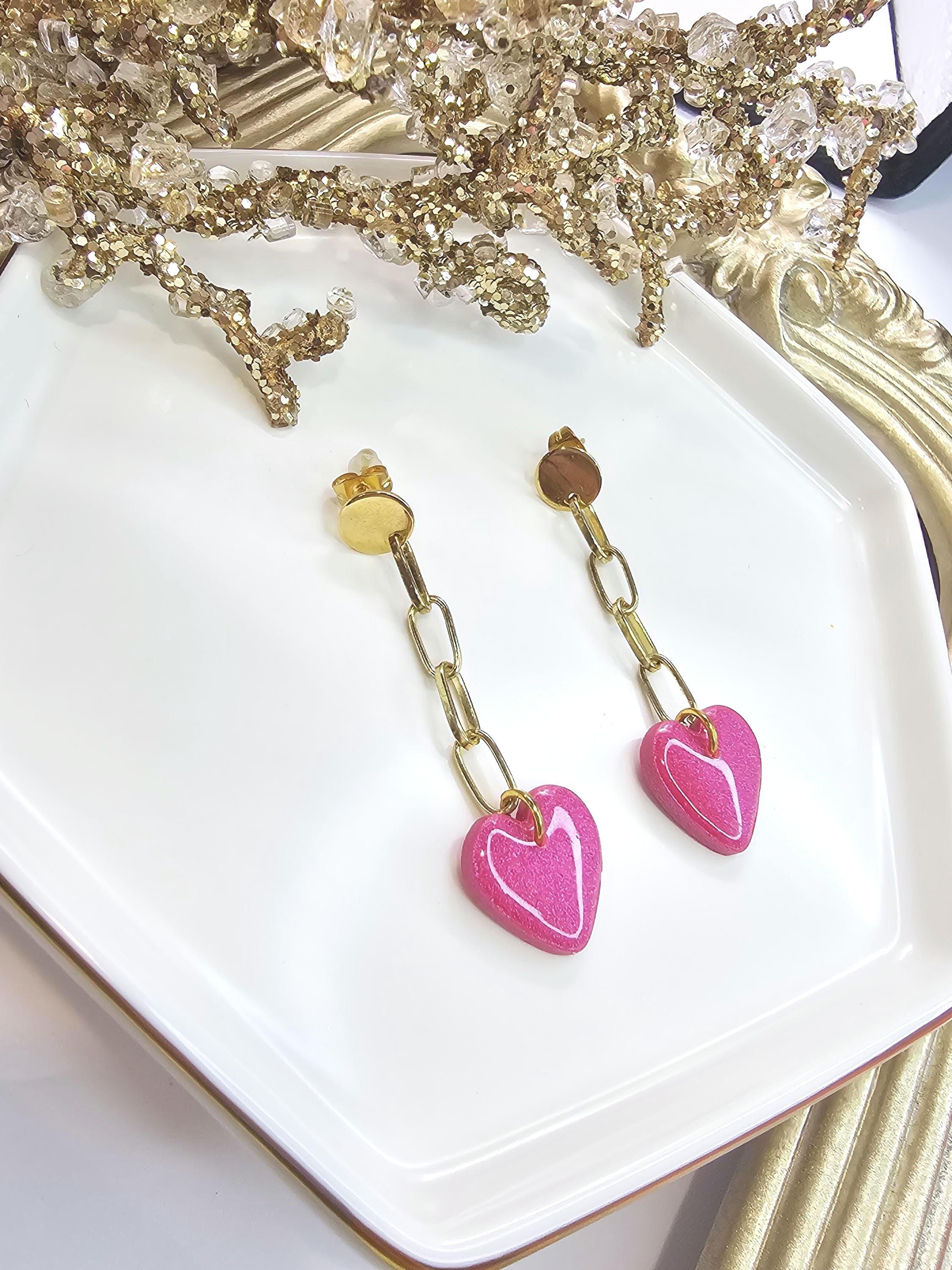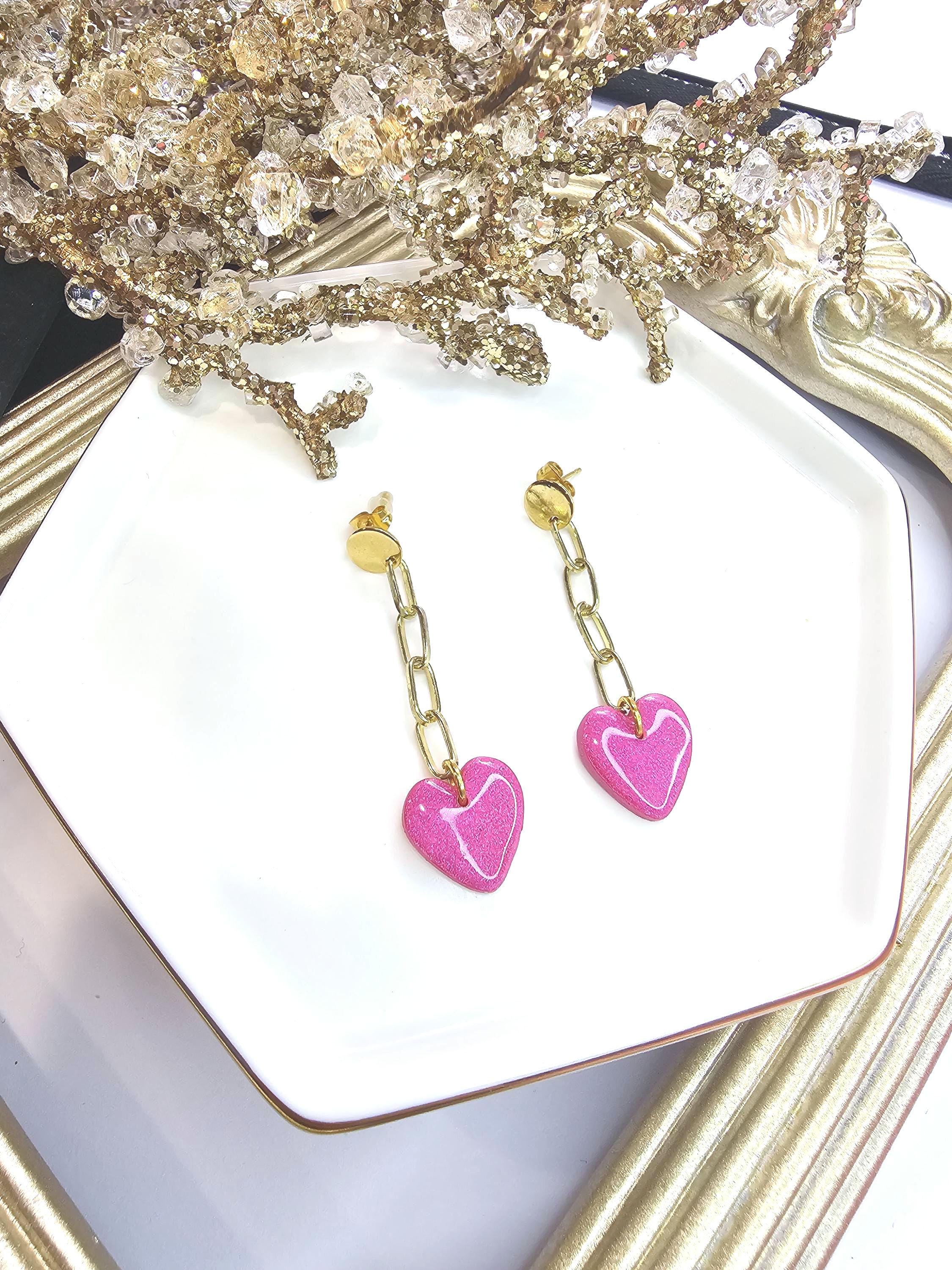 Step up your style with these sleek and modern pink glitter heart chain earrings! Handcrafted from polymer clay and coated with a glossy resin finish, these earrings feature a vibrant pink heart paired with a bold gold-plated chain for a contemporary and elegant look.