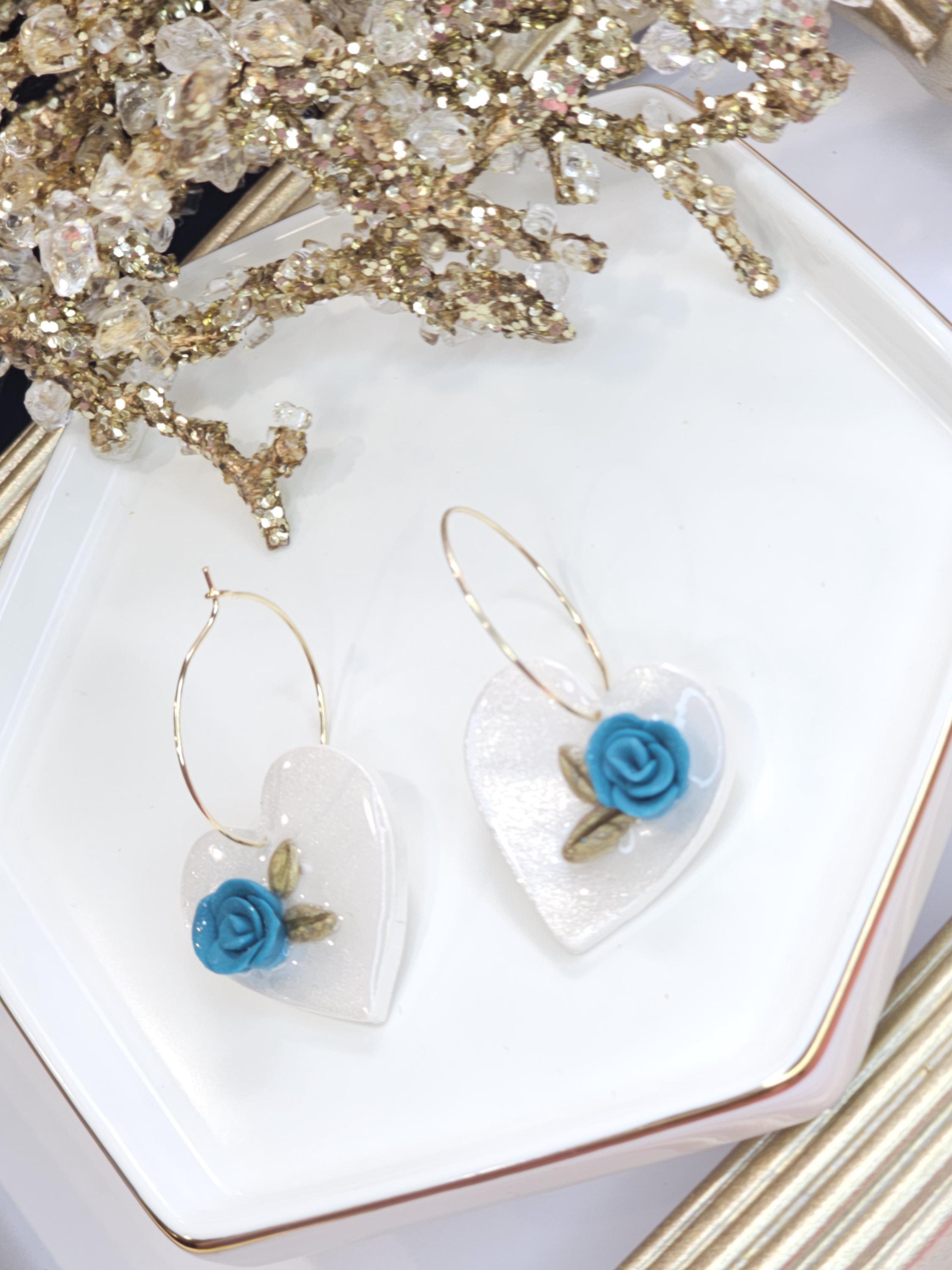 Bring a touch of elegance and charm to your style with these handmade white heart earrings featuring a delicate blue rose design.