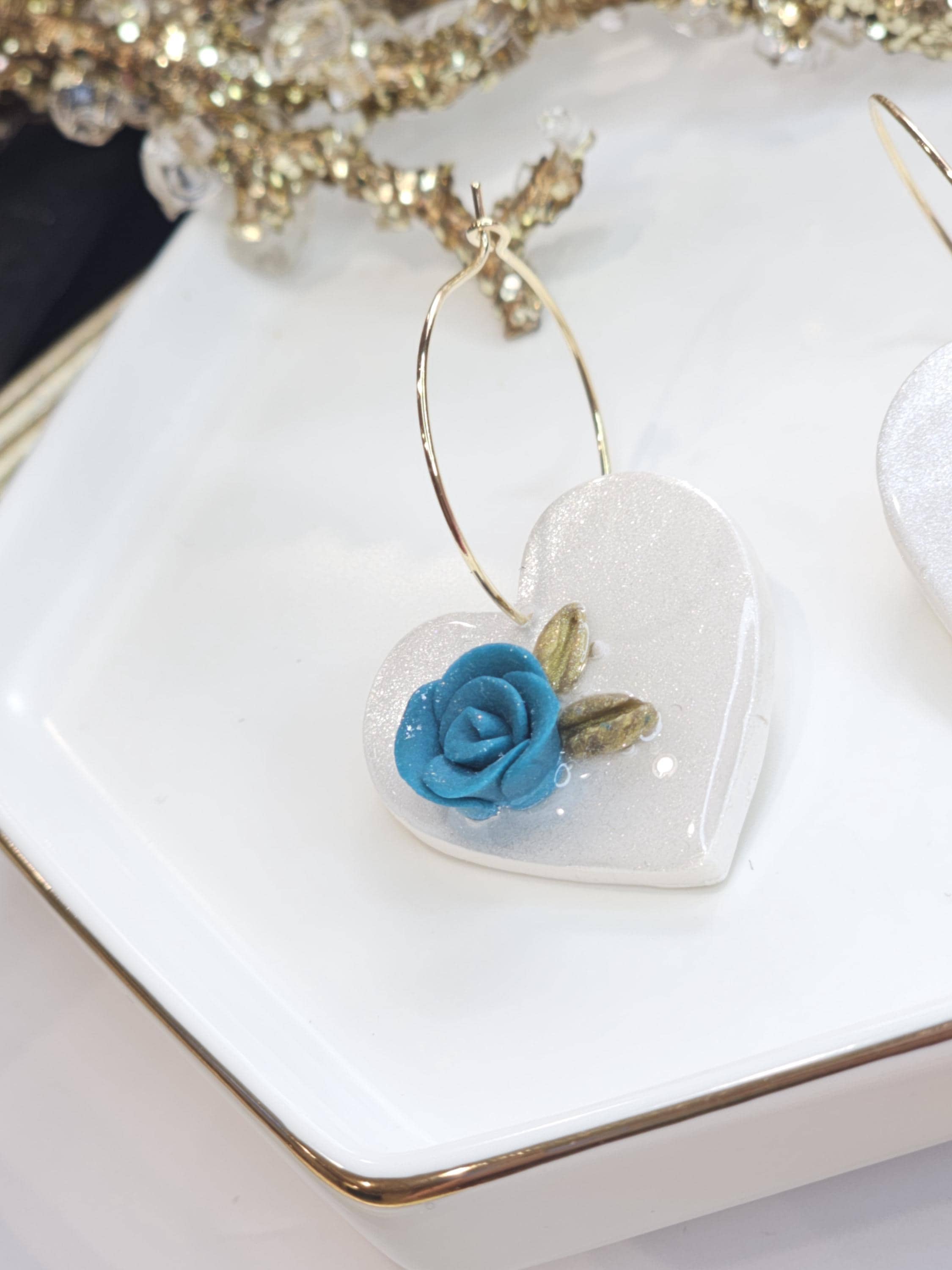 Crafted from polymer clay and coated with a glossy resin finish, these earrings shimmer with sophistication. A hand-sculpted blue rose and subtle green leaves add a pop of color and natural beauty, making these earrings perfect for romantic occasions or everyday elegance.