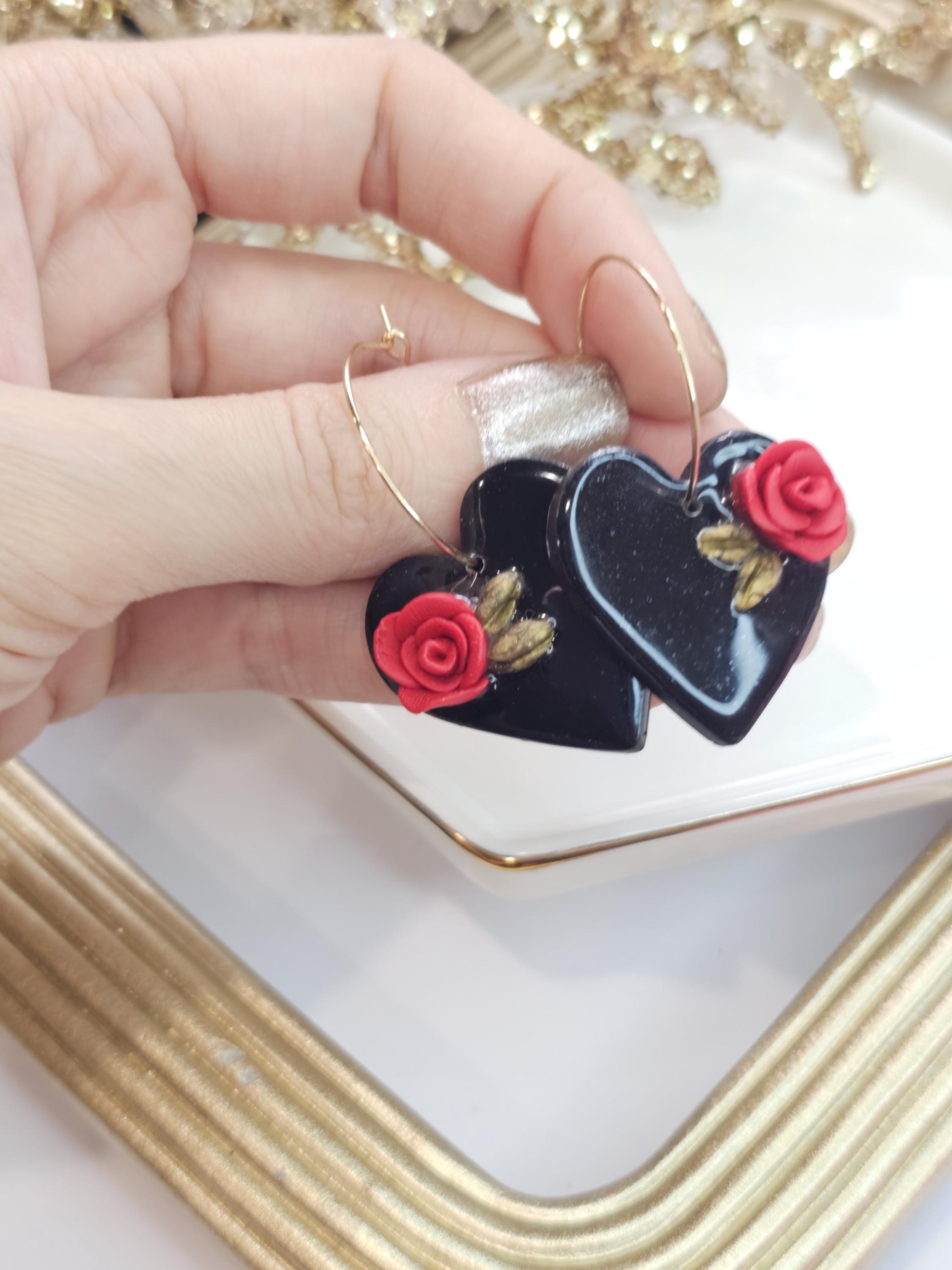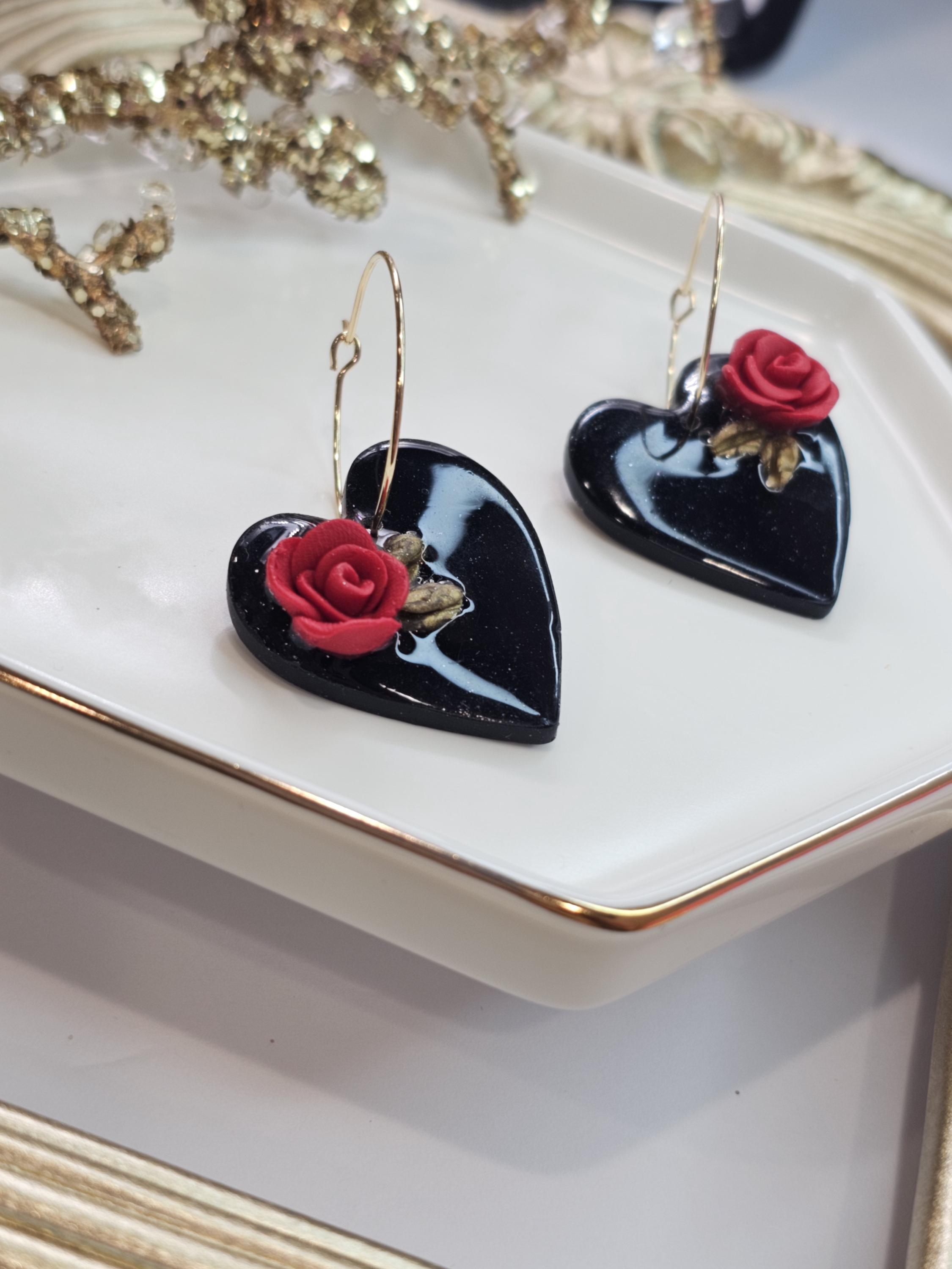 Bring a touch of elegance and charm to your style with these handmade black heart earrings featuring a delicate red rose design.