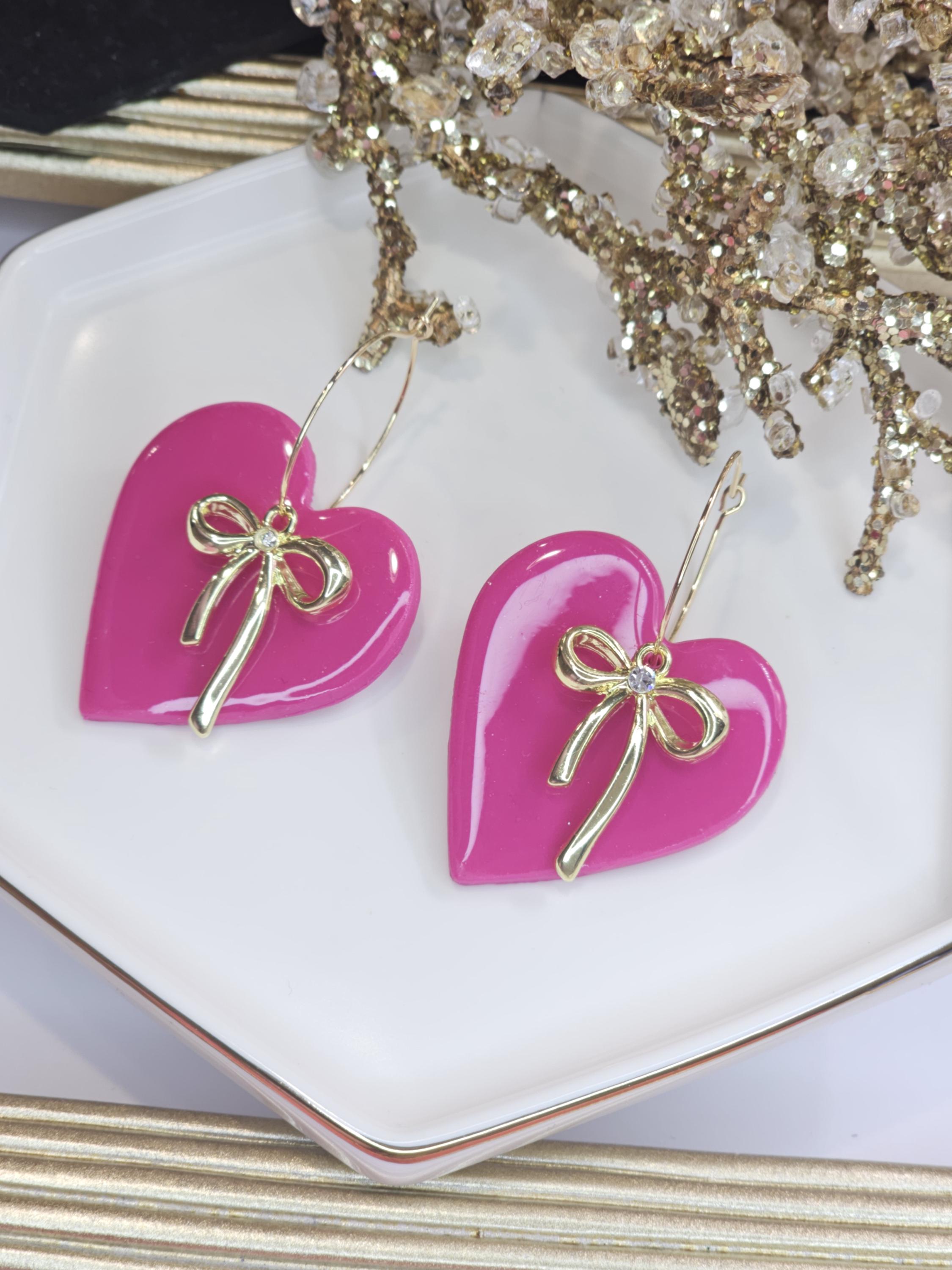 Add a charming and elegant touch to your style with these stunning pink heart dangle earrings. Featuring a glossy resin-coated clay heart adorned with a delicate gold bow, these earrings are perfect for making a statement. The lightweight gold-plated hoops ensure comfortable wear, while the vibrant pink color and chic bow detail make them ideal for special occasions or everyday elegance.