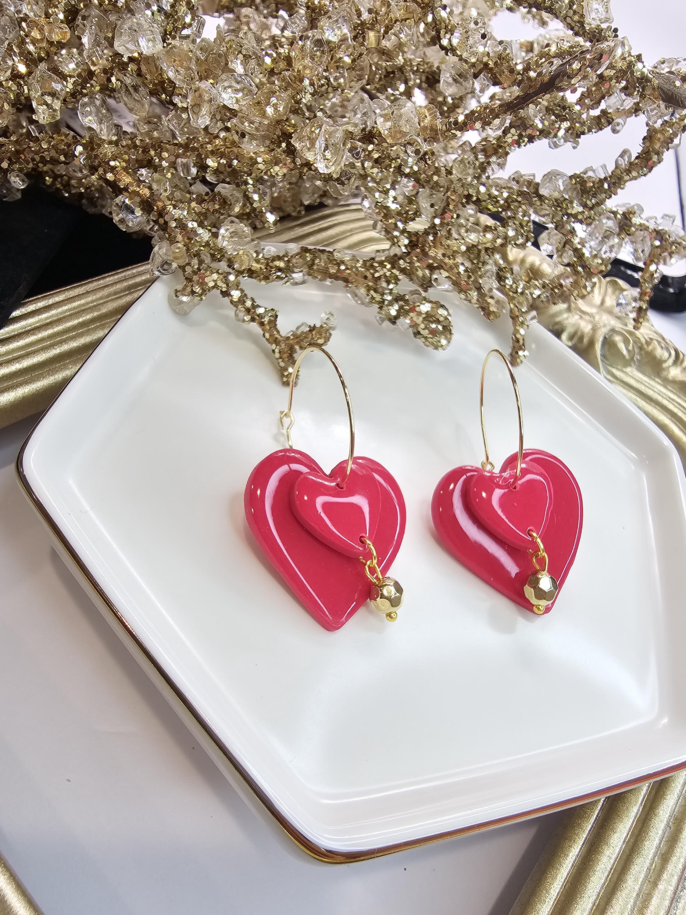 Add a personal touch to your look with these vibrant red layered heart earrings! These earrings are fully customizable: choose one, two, or three hearts to match your style—whether you prefer a simple look or a bold statement. Made from polymer clay and finished with a glossy resin coat, they’re lightweight, unique, and perfect for any occasion.