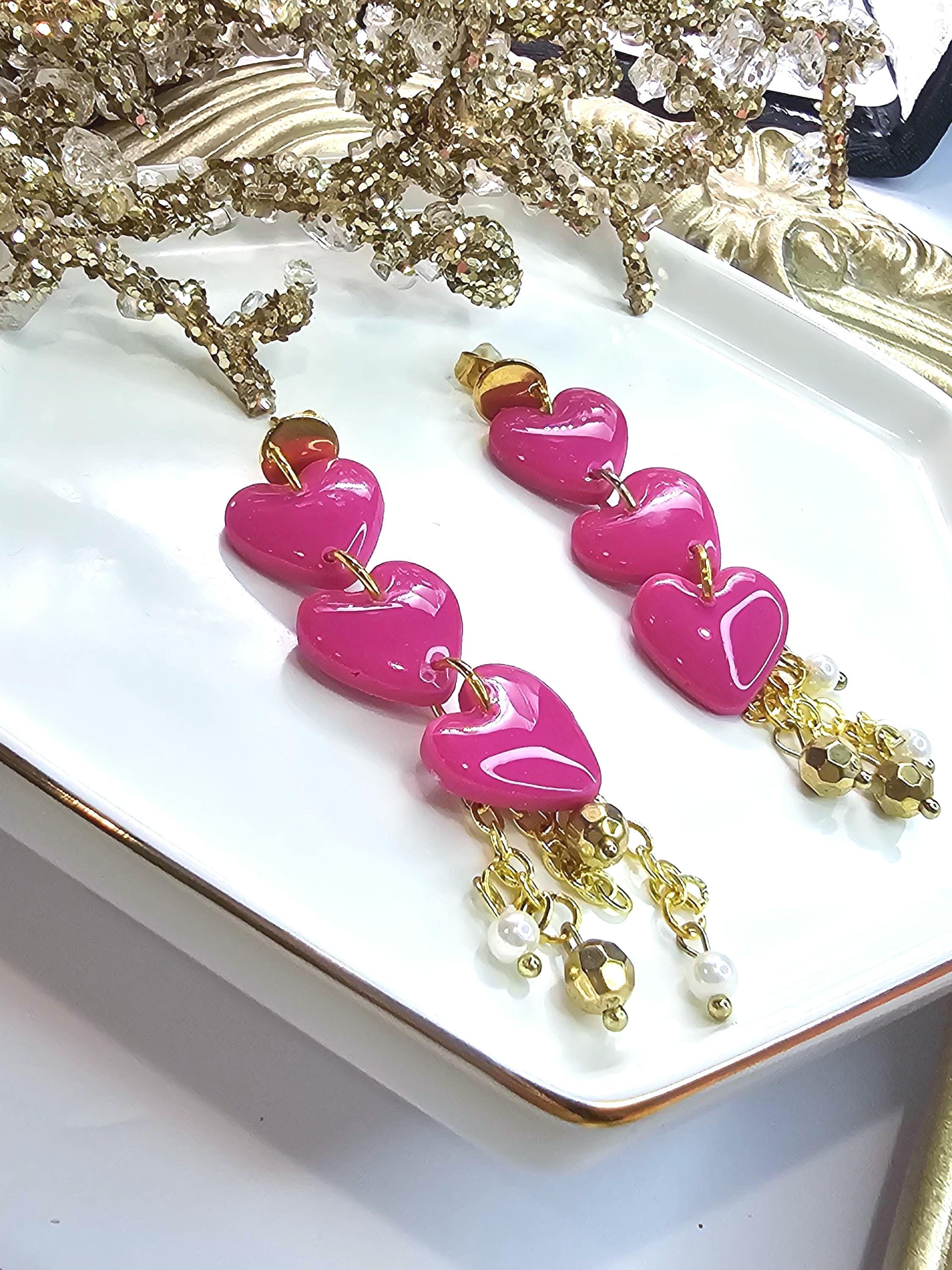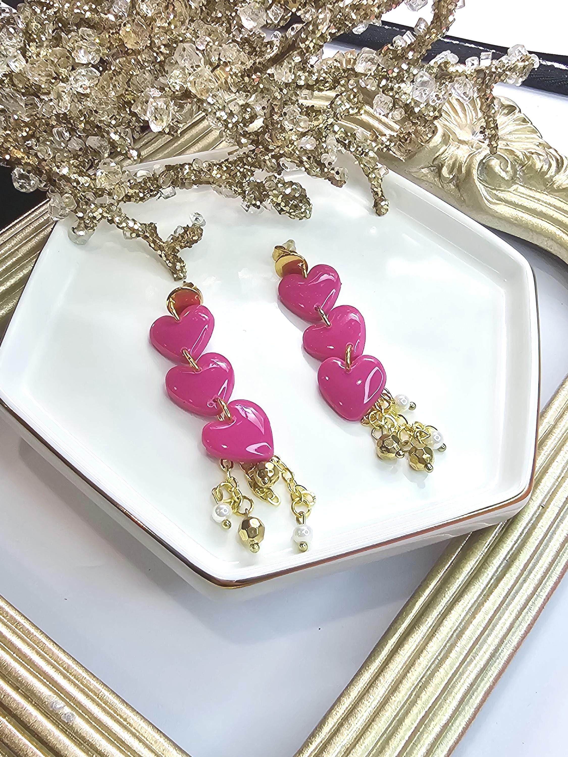 Elevate your style with these glamorous triple-heart dangle earrings, featuring vibrant pink clay hearts coated in a glossy resin finish. Accented with gold-plated details and delicate pearl charms, these earrings bring a perfect blend of elegance and fun. The cascading hearts and shimmering charms make these earrings ideal for statement looks, special occasions, or gifts.