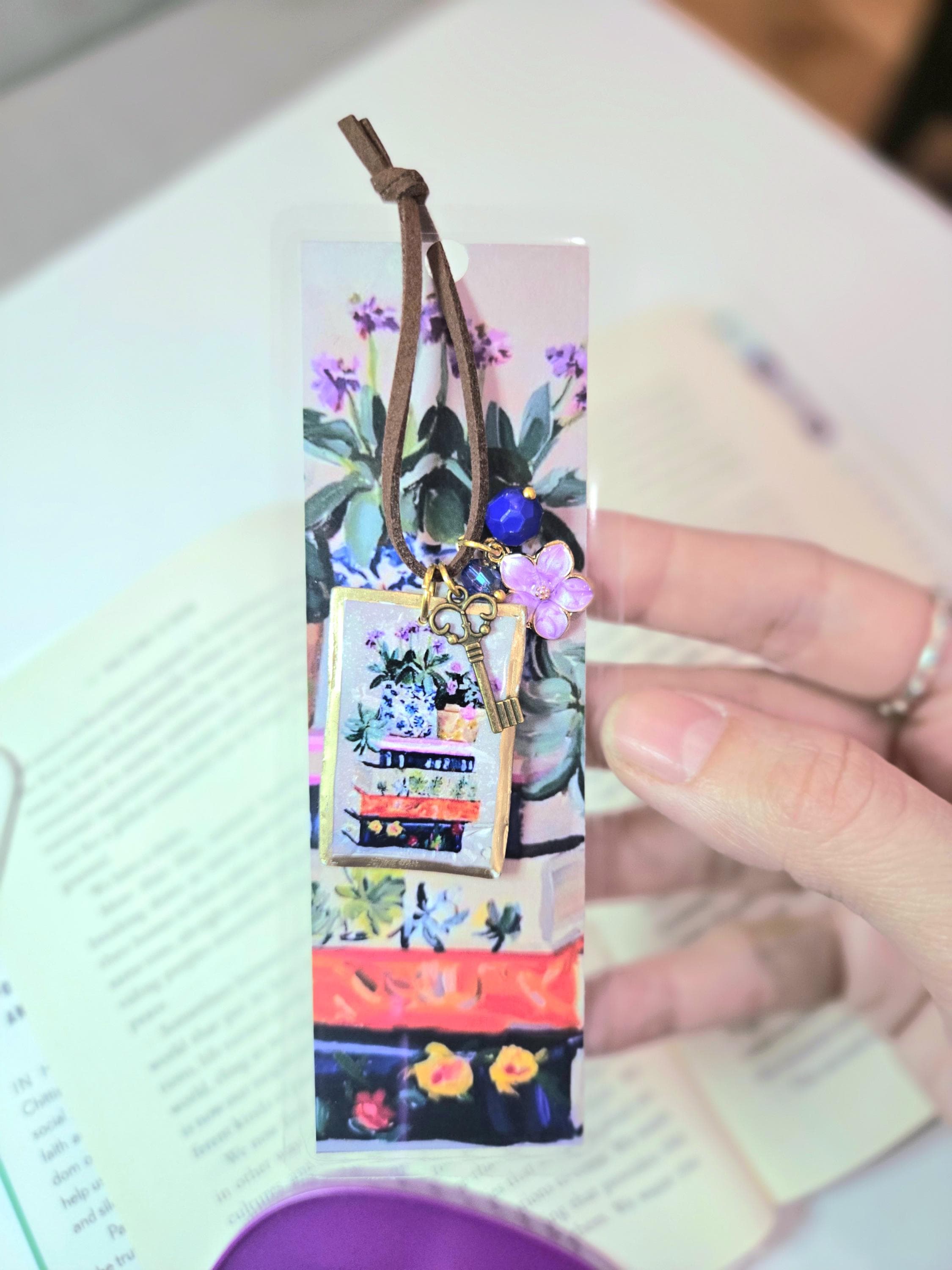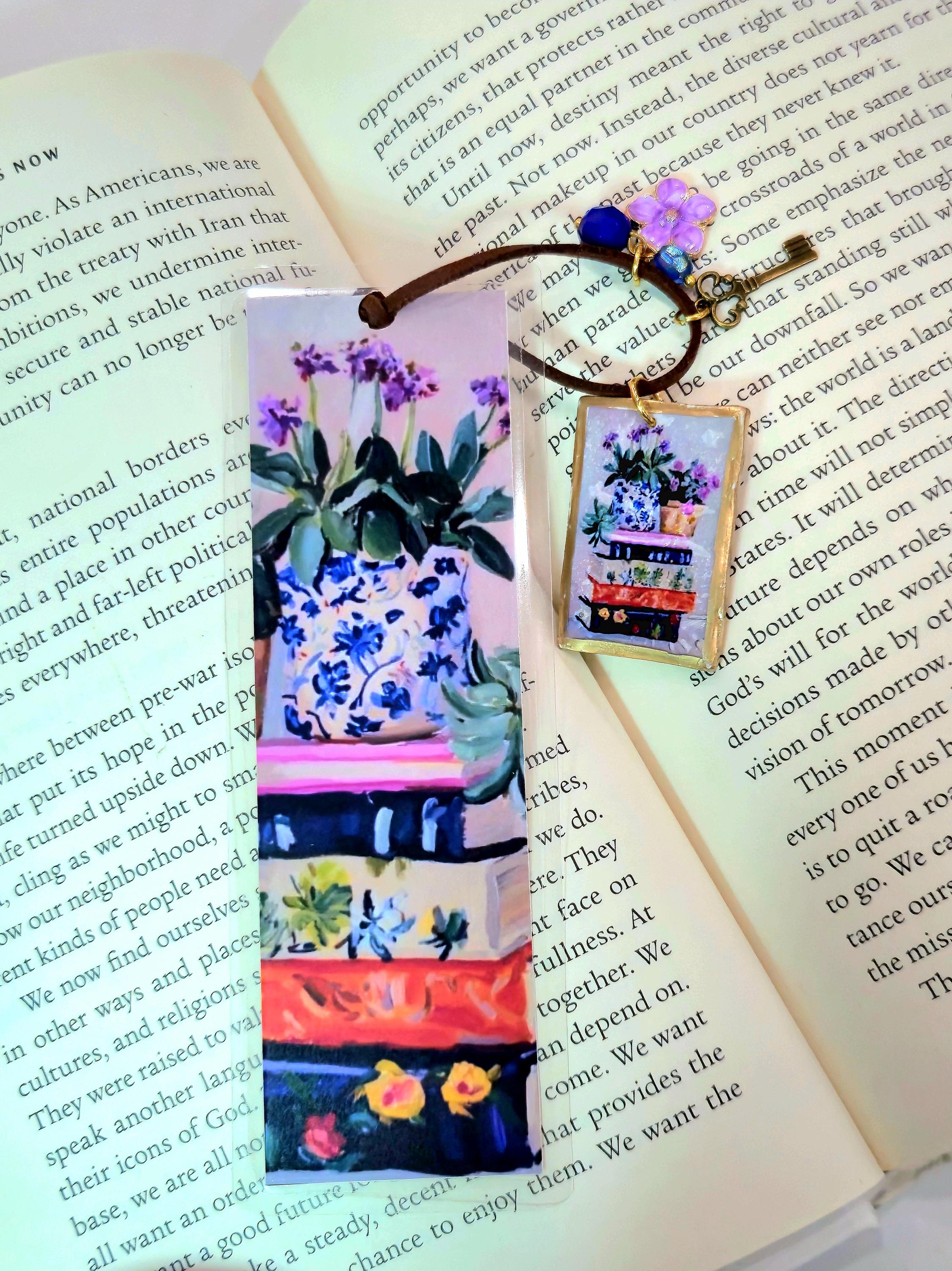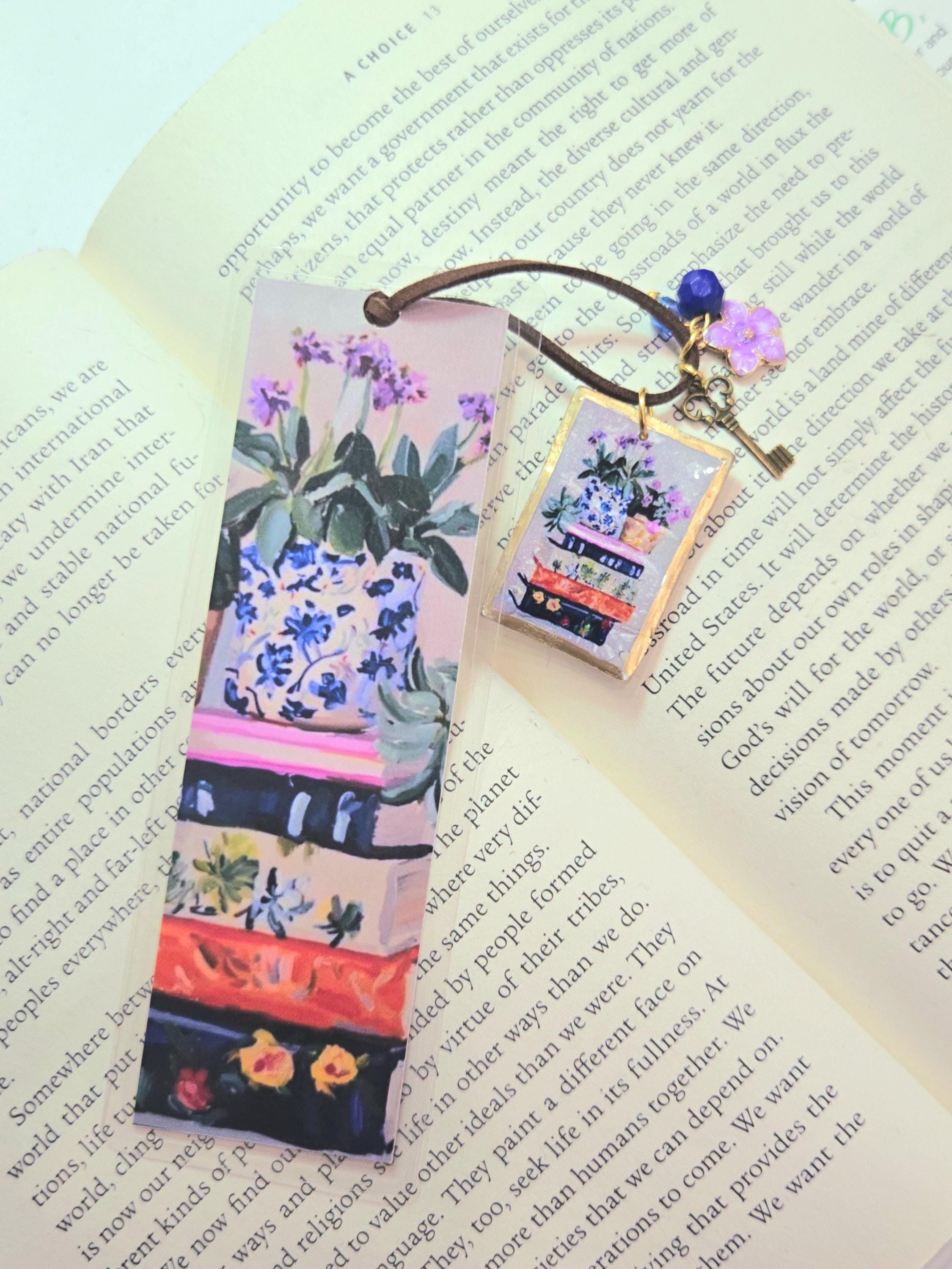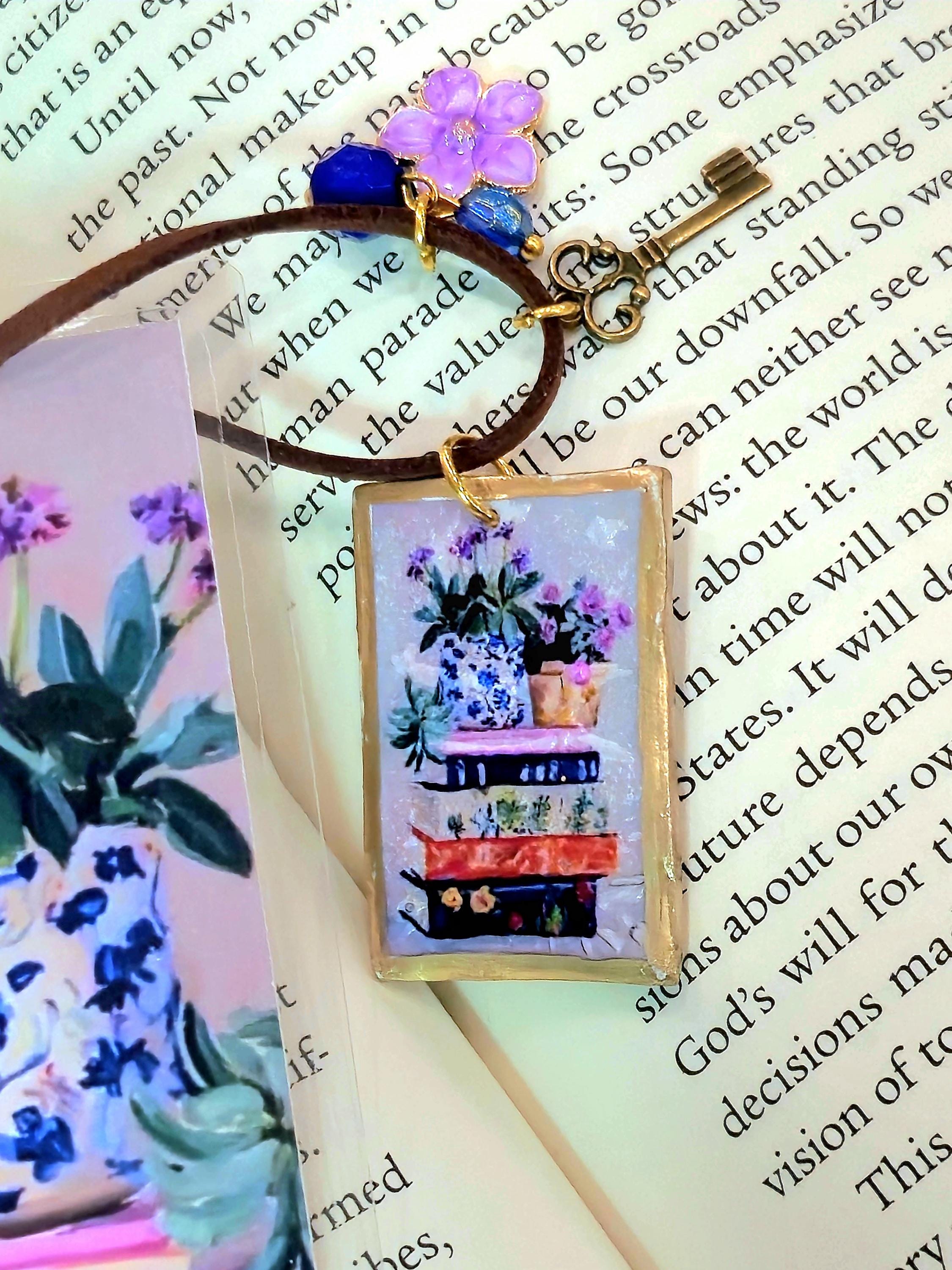 It features an illustrated stack of books topped with soft purple flowers, paired with a handmade clay charm created using a decal transfer technique, giving it a unique artistic finish.