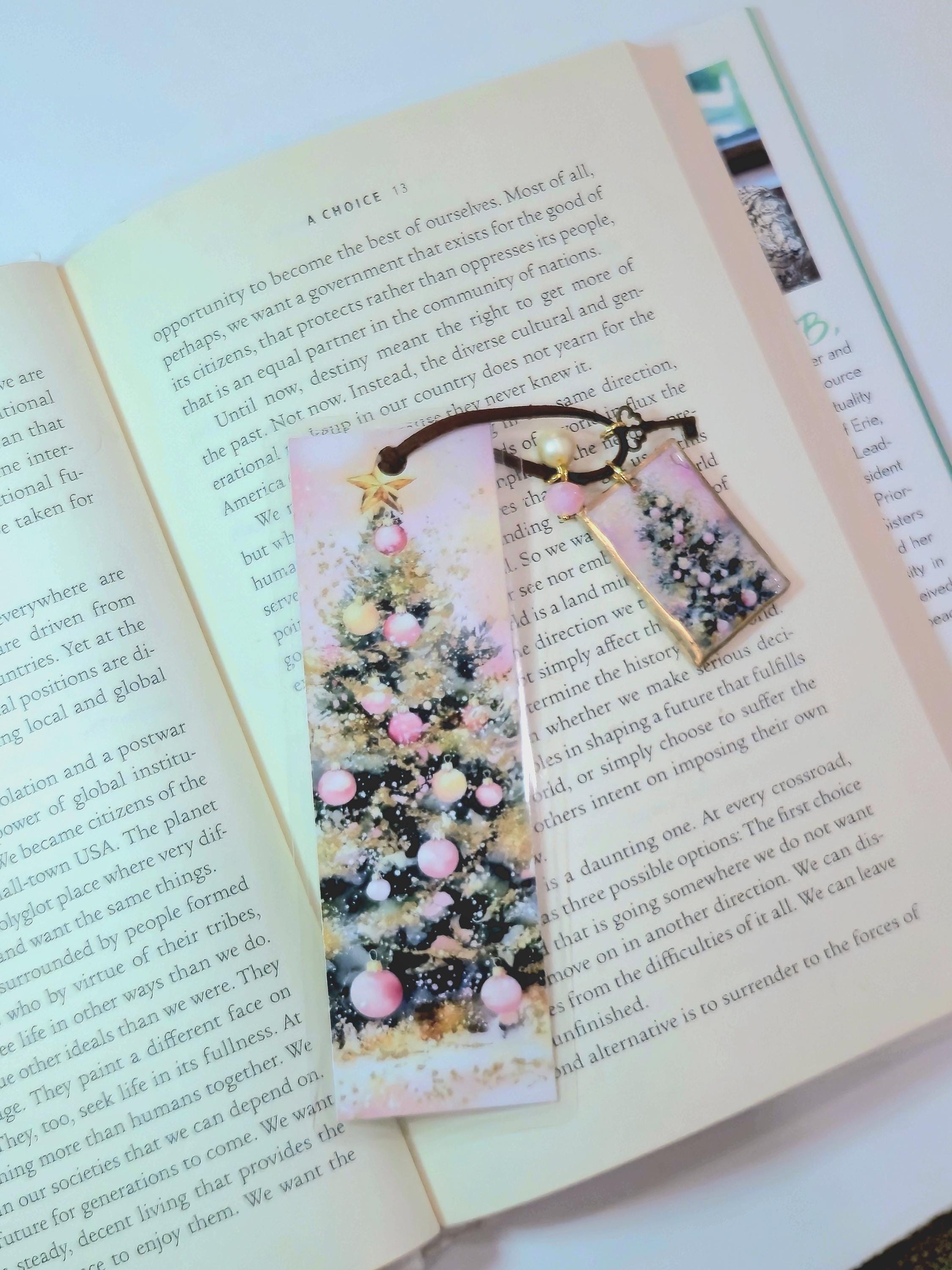 This handmade bookmark is inspired by elegant Christmas nights, soft lights, and quiet winter reading.