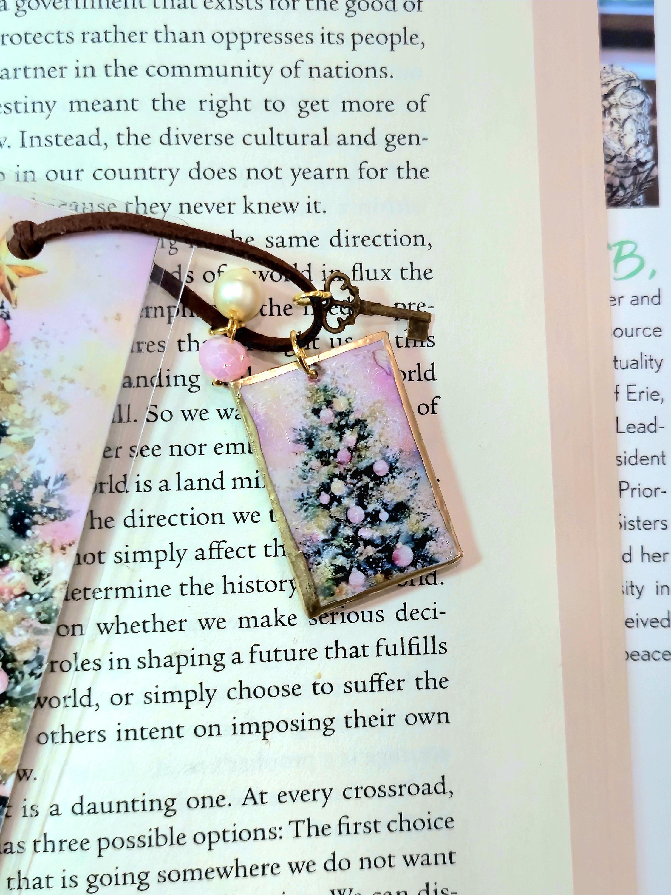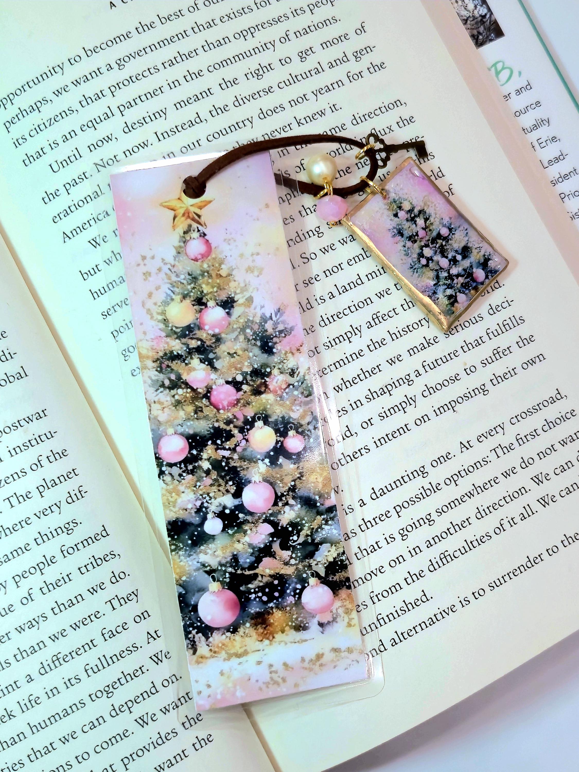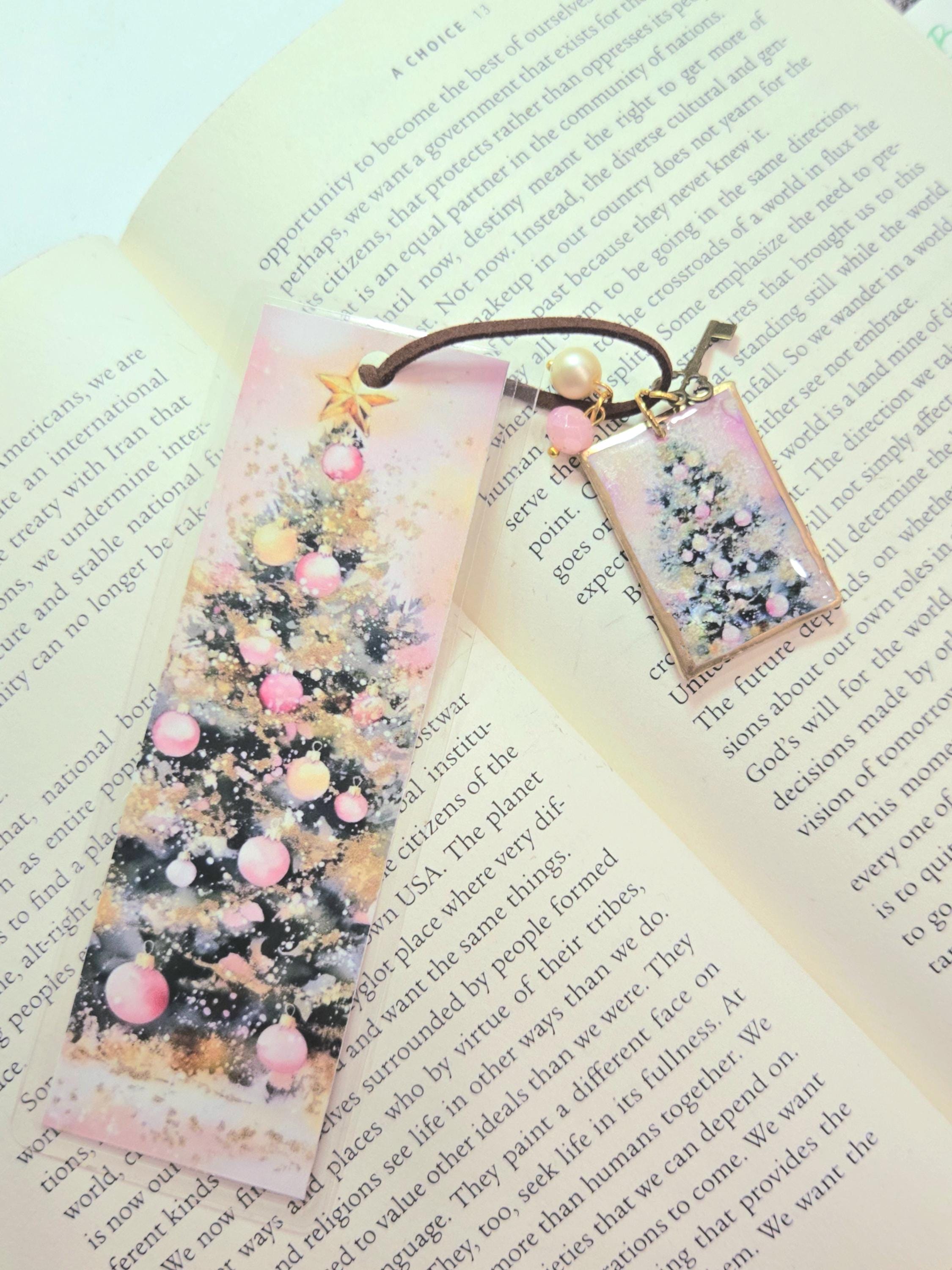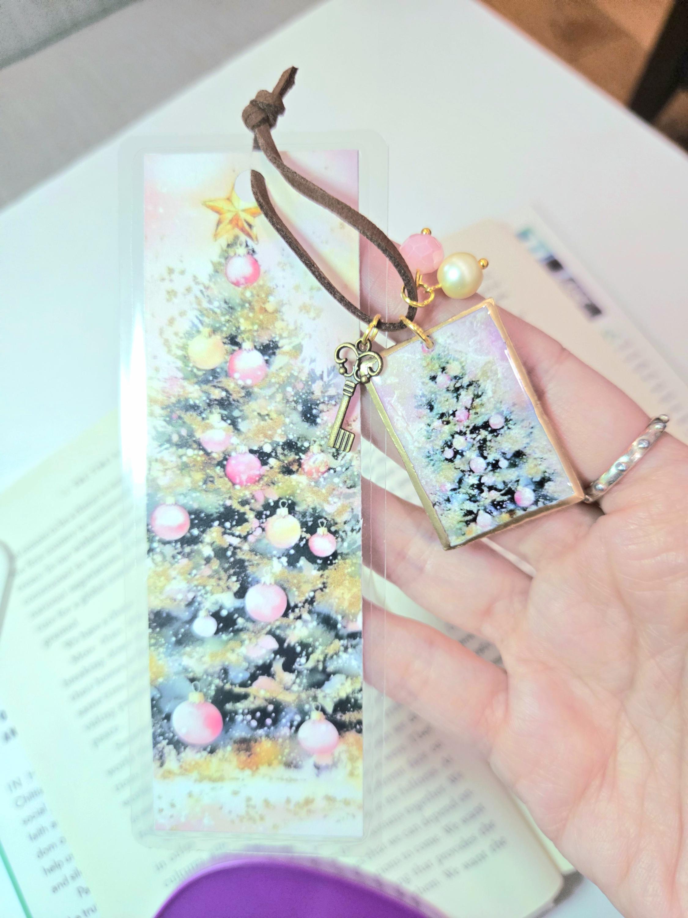 It features a dreamy pink and gold Christmas tree illustration paired with a handmade clay charm created using a decal transfer technique, giving the piece a delicate, artistic finish.