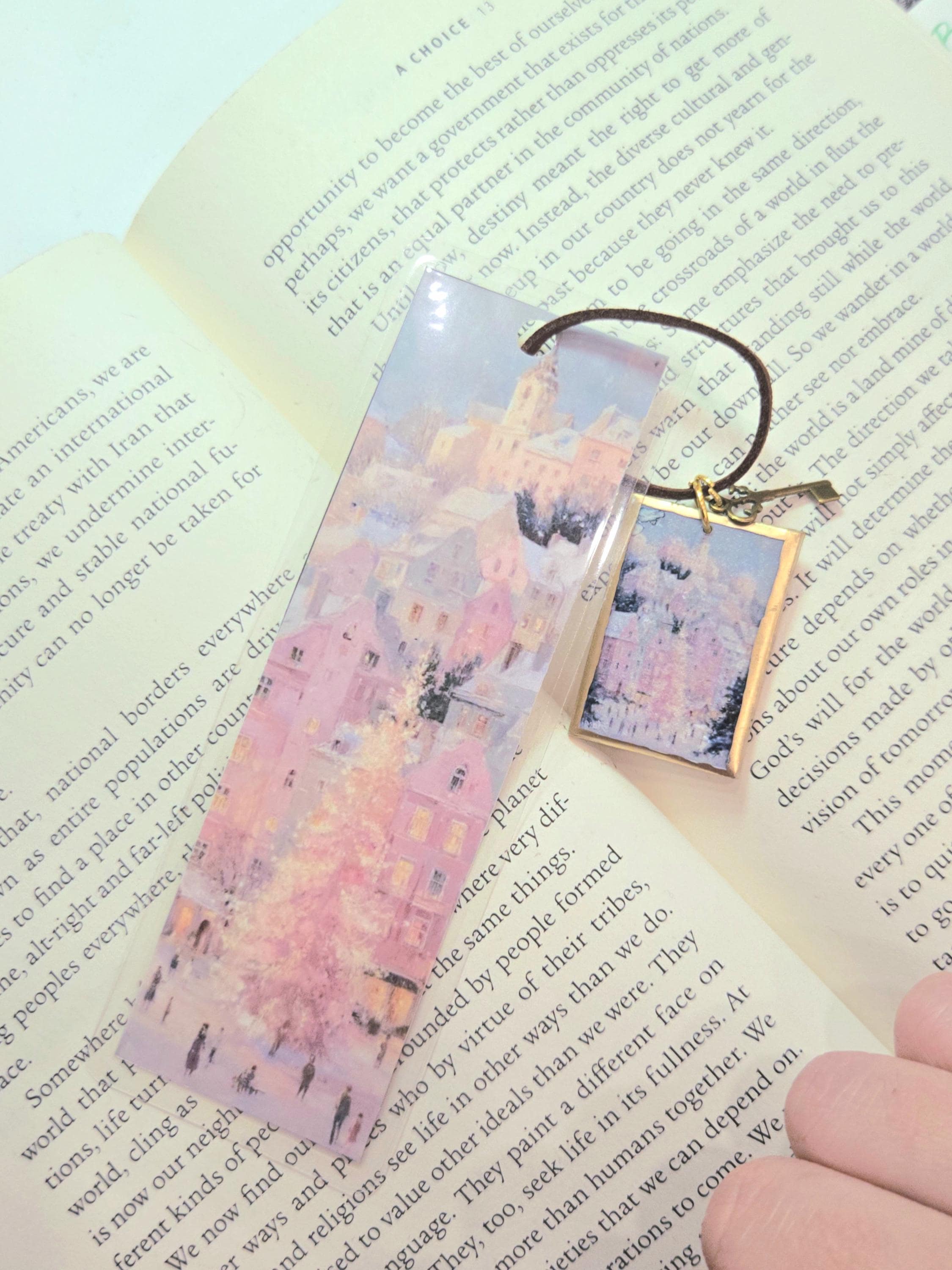 This handmade bookmark captures the magic of a pastel winter village—soft pink buildings, glowing windows, and gentle snowfall that feels straight out of a fairytale. Designed for readers who love calm, cozy moments, this piece turns everyday reading into something special.