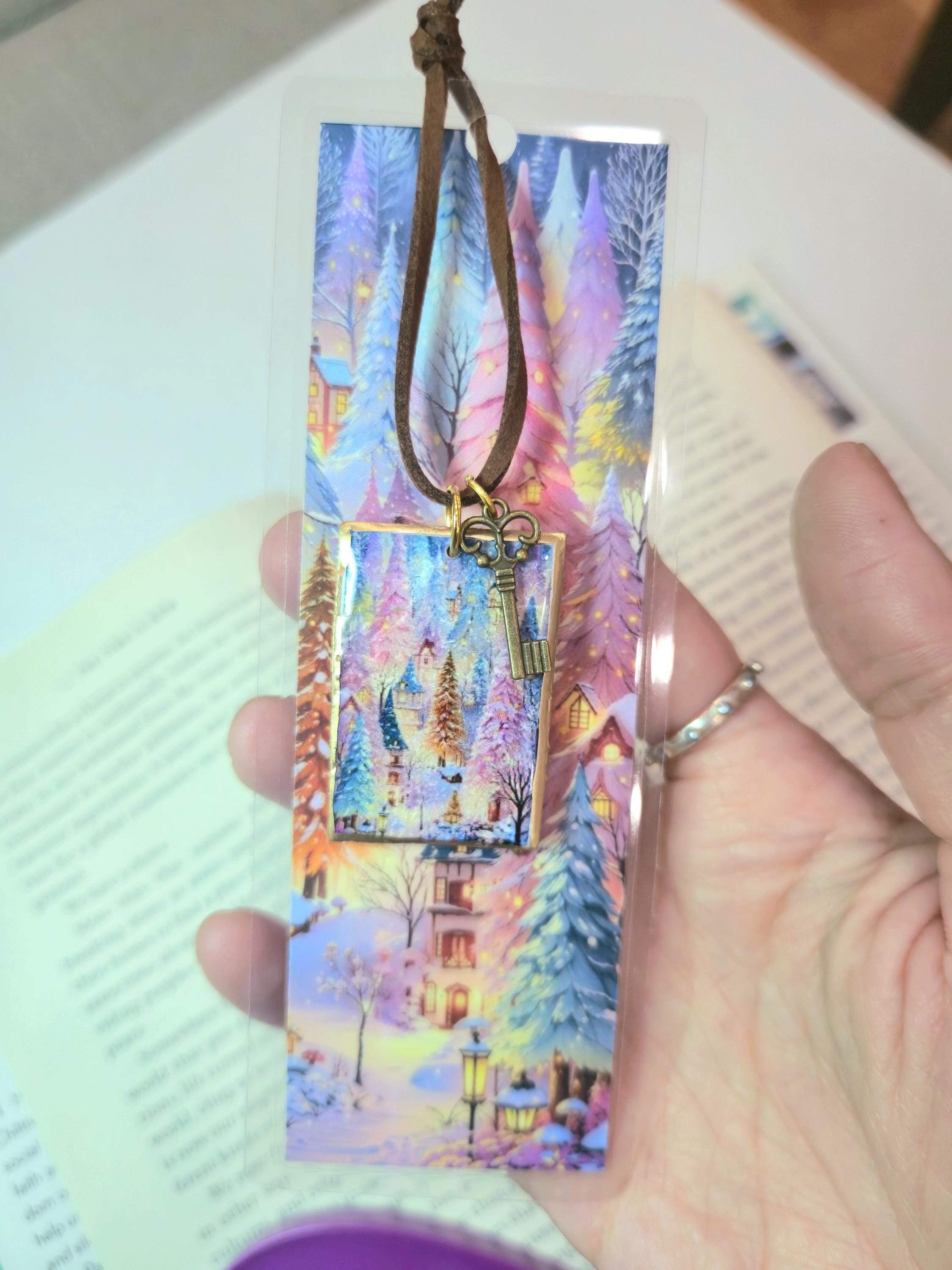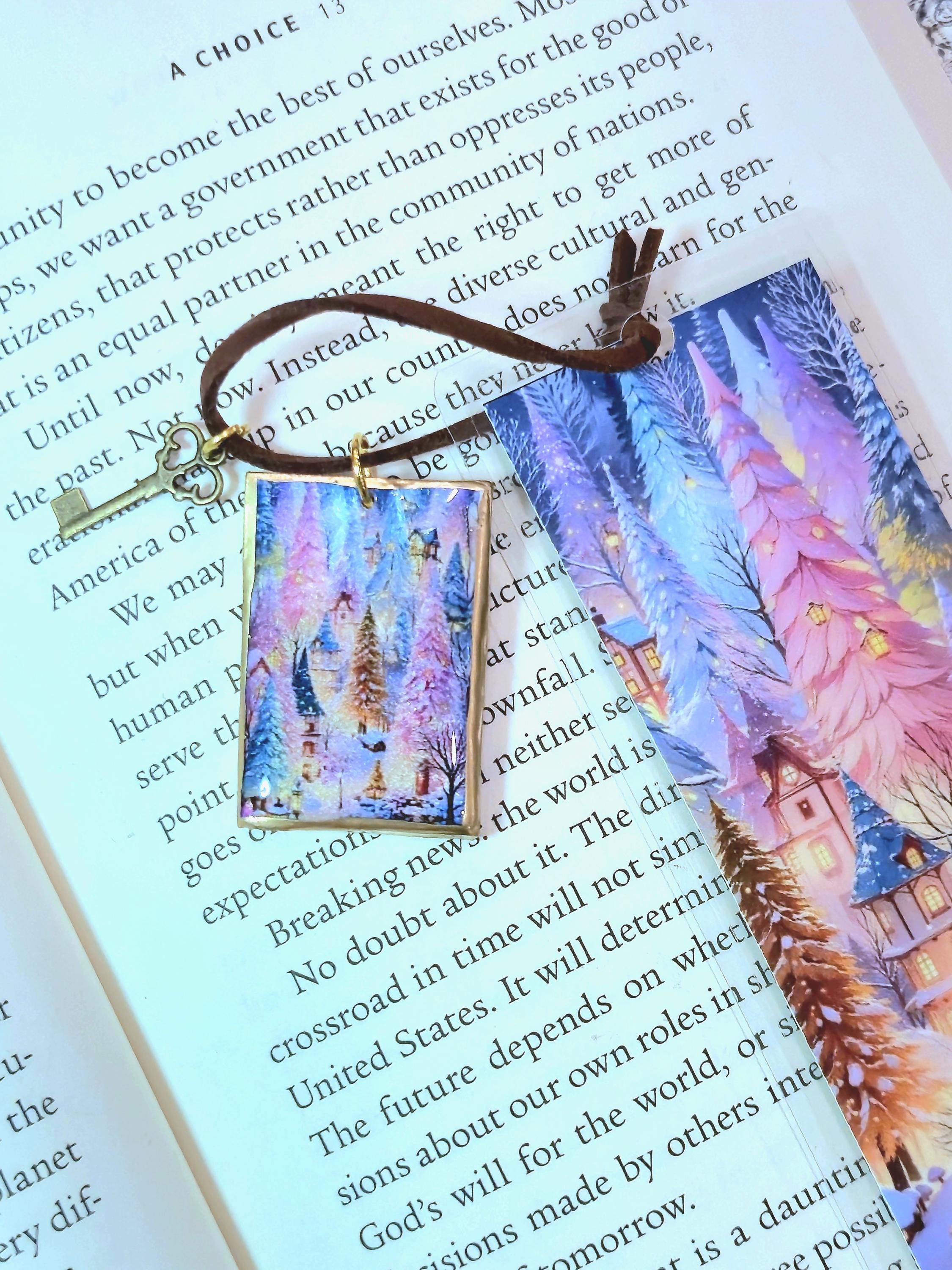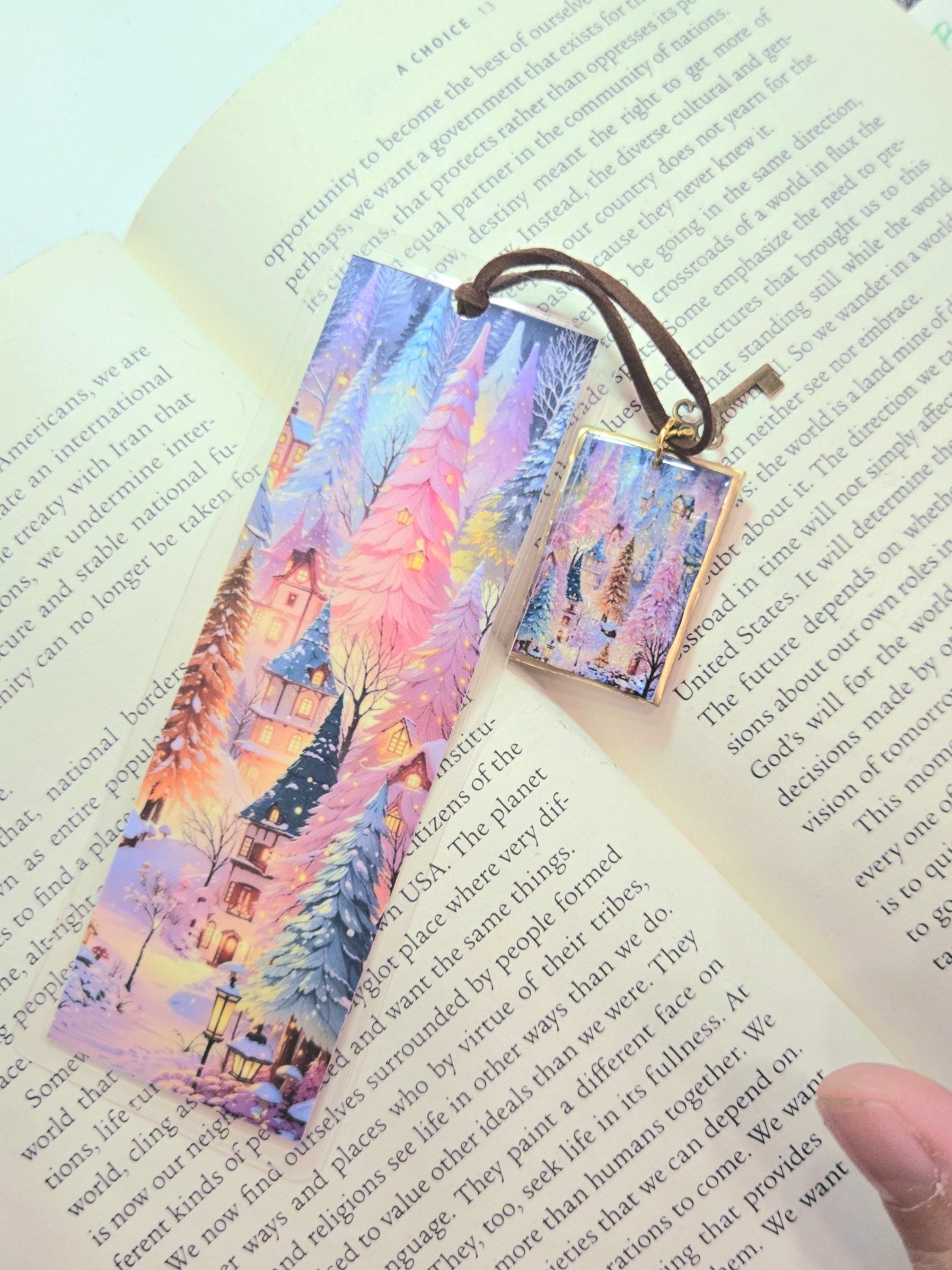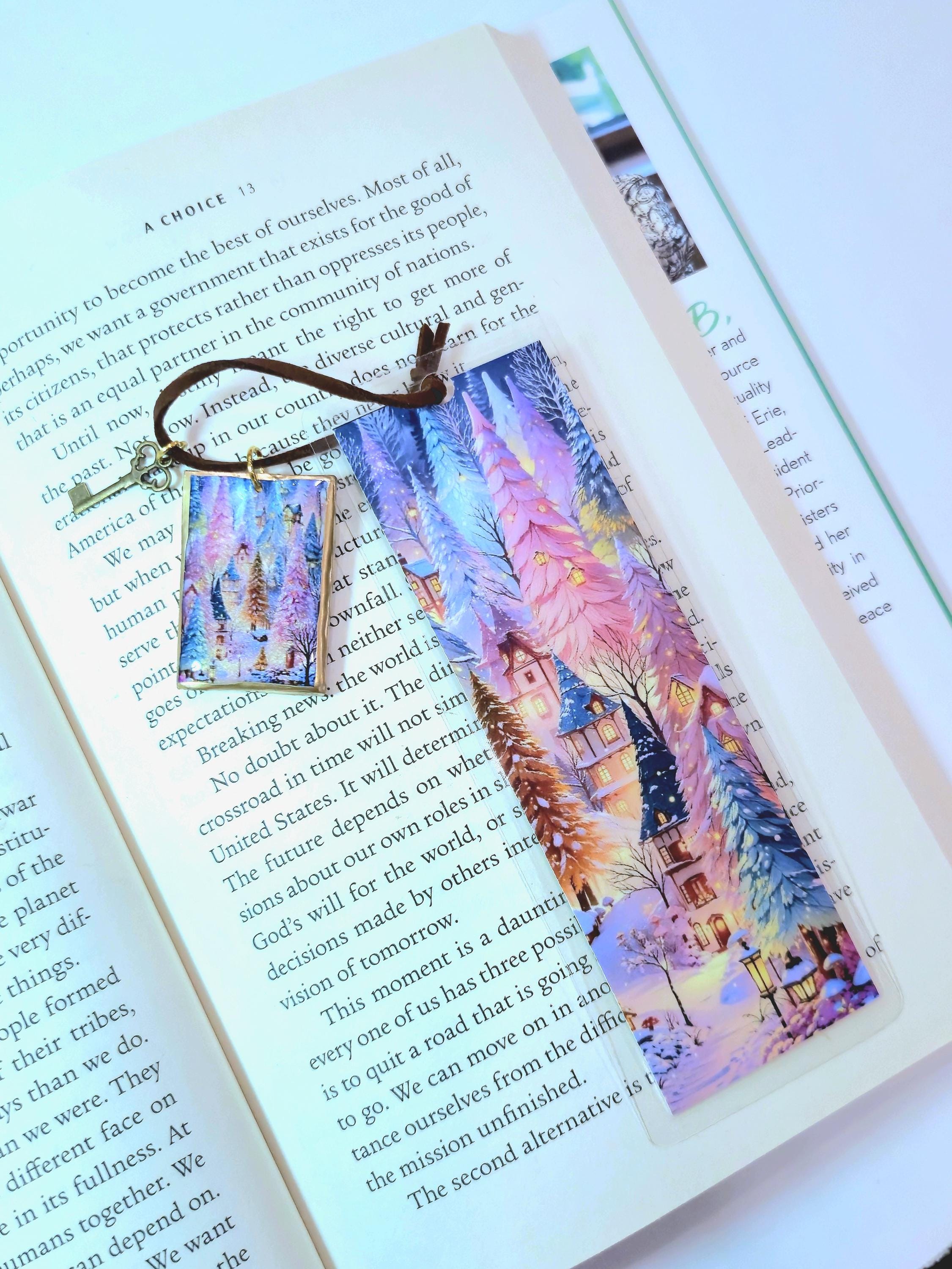 This handmade bookmark feels like stepping into a winter fairytale—soft glowing houses nestled among tall pastel trees, gentle snowfall, and warm lights shining through the forest. It’s designed for readers who love magical worlds, quiet evenings, and books that feel like an escape.