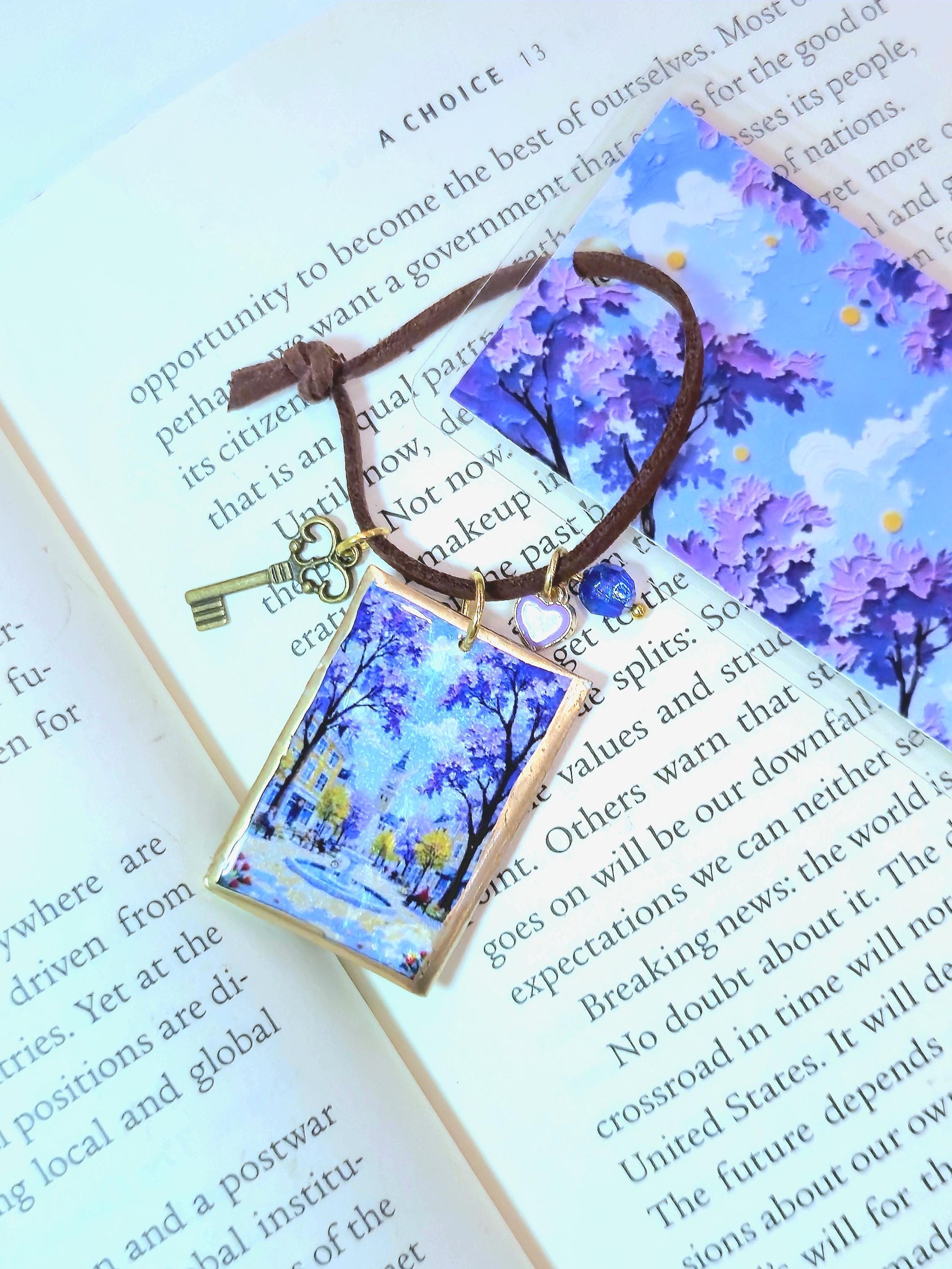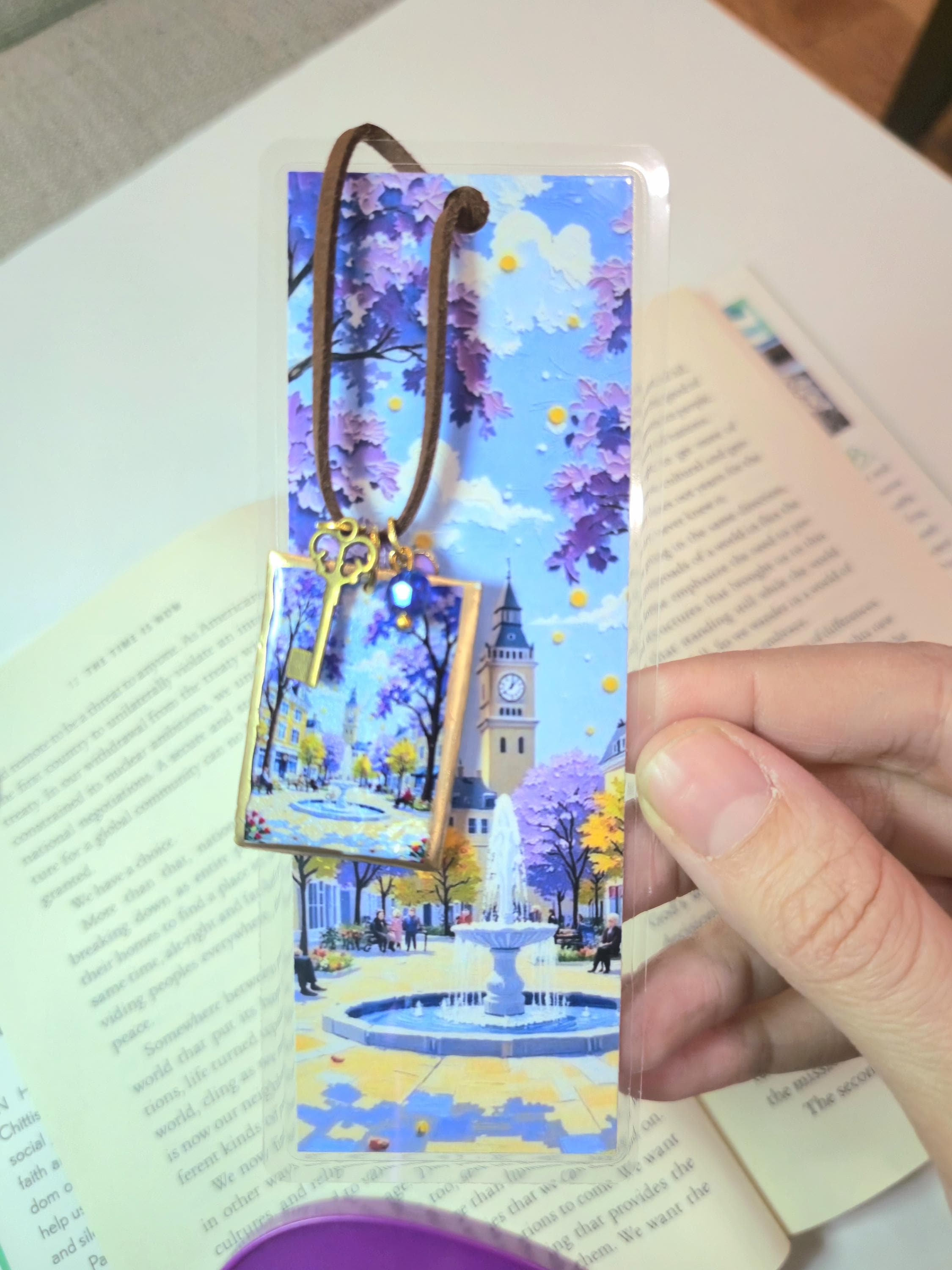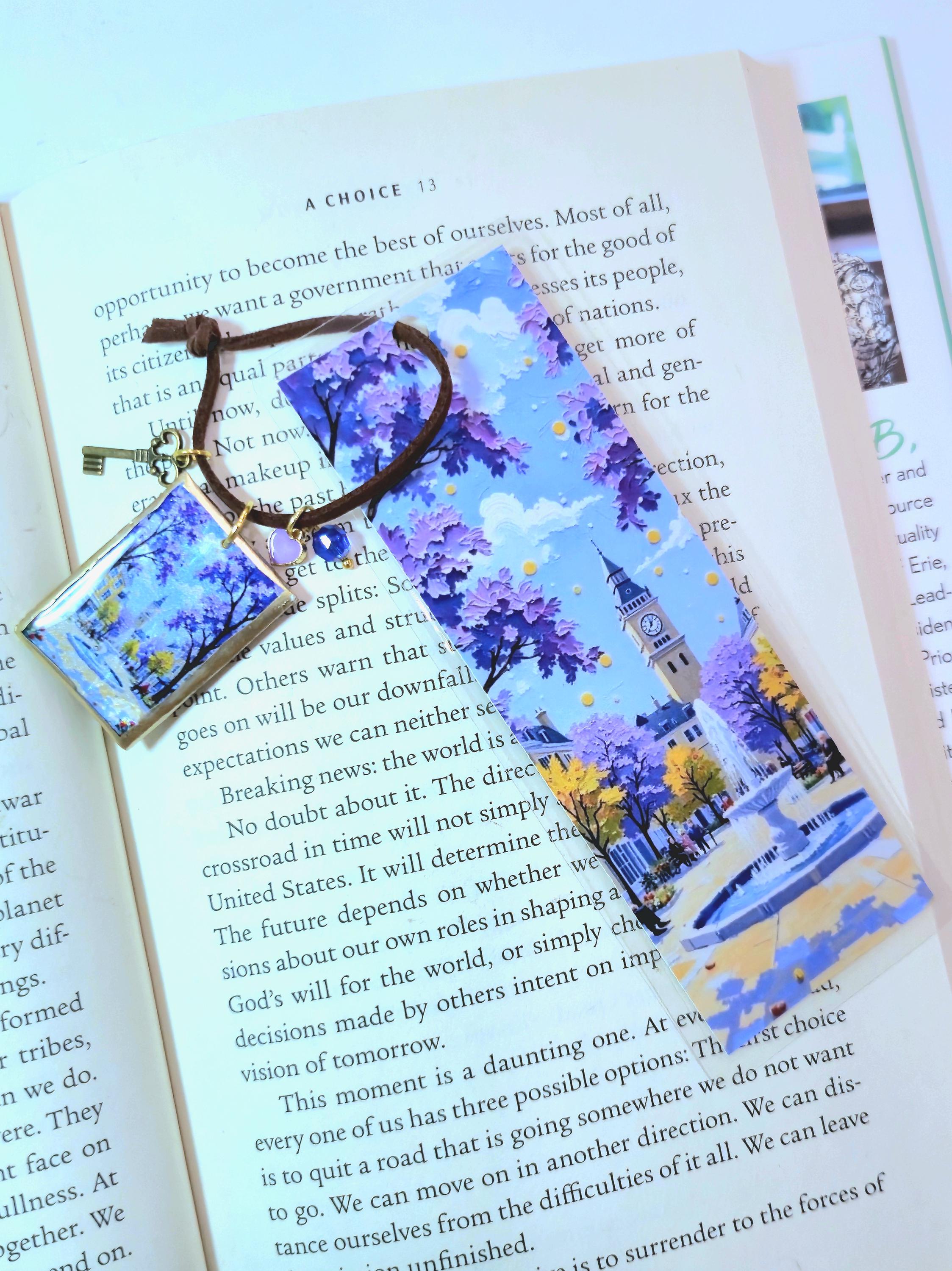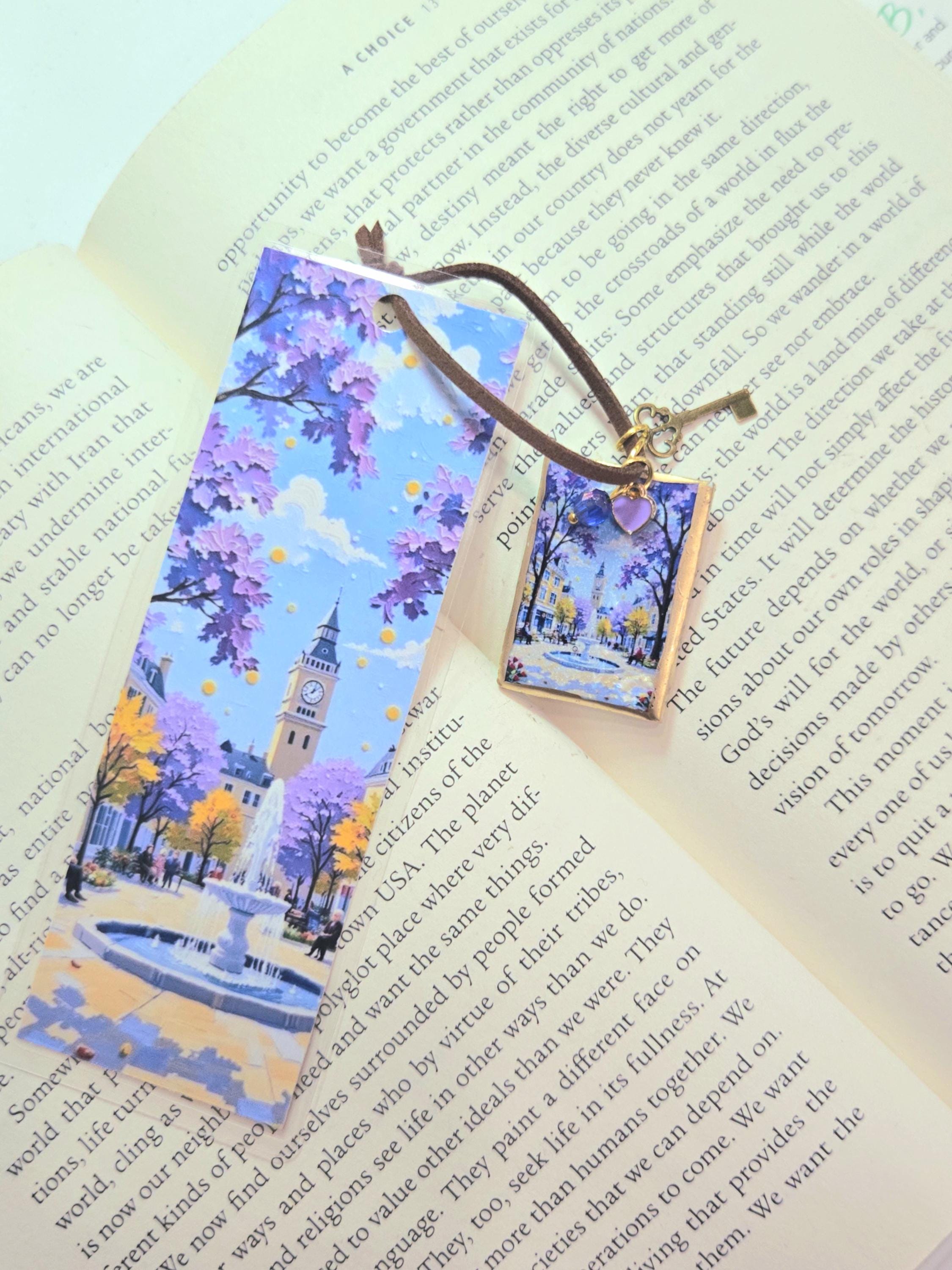 This handmade bookmark captures a peaceful storybook city scene—lavender trees in bloom, warm light drifting through a quiet square, and a gentle fountain beneath a clock tower. It feels like a paused moment in a novel, inviting you to slow down and stay with the story a little longer.