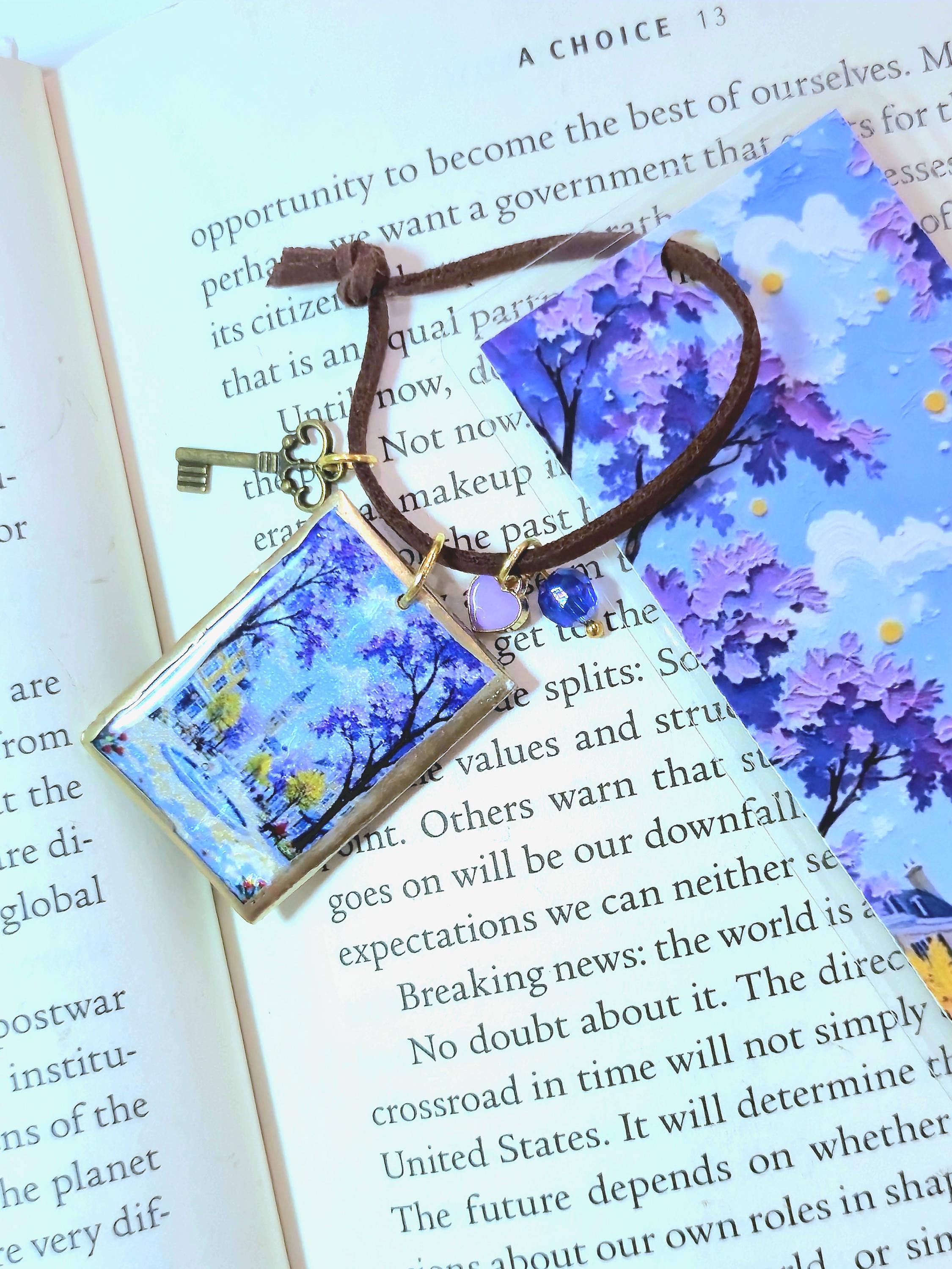 The bookmark is finished with a handmade clay charm created using a decal transfer technique, adding a delicate artistic accent without adding weight to your pages. The laminated surface protects the artwork, while the soft faux leather cord makes it easy to find your place and adds a warm handcrafted feel.